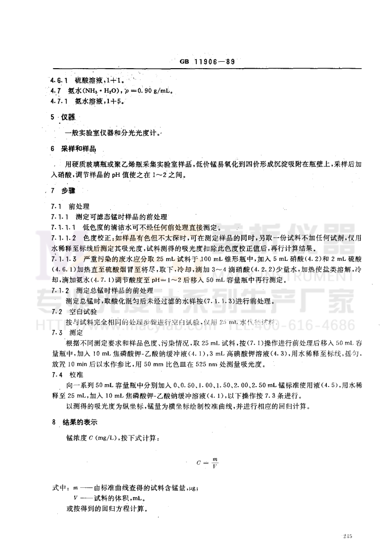 中华人民共和国国家标准水质锰的测定GB11906-89高碘酸钾分光光度法Water quality-Determination of manganesePotassium periodate spectrophotometric method1主题内容与适用范围1.1本标准规定了测定水中锰的高碘酸钾分光光度法。本标准适用于饮用水、地面水、地下水和工业废水中可滤态锰和总锰的测定。1.2测定范围使用光程长为50mm的比色皿,试料体积为25mL时,方法的最低检出浓度为0.02mg/L,测定上限为3'mg/L。含锰量高的水样,可适当减少试料量或使用10mm光程的比色皿,测定上限可达9mg/L。2定义2.1可滤态锰MACY INSTRUMENT样品采集后,立即在现场用0.45um滤器过滤并酸化滤液,滤液中测得的锰量为可溶性锰。2.2总锰样品采集后不过滤立即酸化,经消解后测得的锰量。3原理://www.macylab.com TEL:400:.616-4686在中性的焦磷酸钾介质中,室温条件下高碘酸钾可在瞬间将低价锰氧化到紫红色的七价锰,用分光光度法在525nm处进行测定。4试剂,本标准所用试剂除另有说明外,均为分析纯试剂和蒸馏水或具有同等纯度的水。4.1焦磷酸钾-乙酸钠缓冲溶液:称取焦磷酸钾(KP,O,·3Hz0)230g,三水乙酸钠(CHC00Na·3Hz0)136g溶于热水中,冷却后定容到1L,此溶液浓度焦磷酸钾为0.6mol/L乙酸钠为1.0mol/L。4.2.硝酸(HNO3),p=1.4g/mL。4.2.1硝酸溶液,1+9。4.2.2硝酸溶液,1十1。4.3·高碘酸钾,20g/L溶液:称2g高碘酸钾(K10,优级纯)溶于100mL硝酸(4.2.1)溶液中。4.4锰标准储备液,1.00gL:称取1.000g纯度不低于99.9%的电解锰,溶于20mL硝酸(4.2.2)溶液中,微热全溶后移入1000mL容量瓶中,用水稀释至标线,摇匀,4.5锰标准使用液,50.0g/mL:吸取10.00mL锰标准储备液(4.4)于200mL容量瓶中,用水稀释至标线,摇匀。4.6疏酸(HS0),p=1.848/mL。国家环境保护局1989-12-25批准1990-07-01实施244