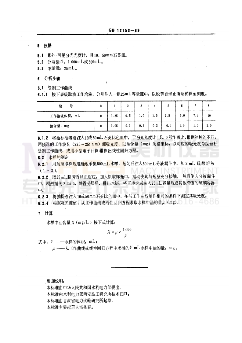 中华人民共和国国家标准锅炉用水和冷却水分析方法油的测定紫外分光光度法GB12153-89A nal ysis of water used in boiler and coolingsystem-Determi nati on of mineral oil-Ultravioletspect rophotometry1主题内容与适用范围本标准规定了火力发电厂锅炉给水、生产返回水及化工设备冷却水油含量的测定方法。本标准适用于锅炉用水及冷却水分析。油含量0.1~4.0mg/L。2引用标准GB6903锅炉用水和冷却水分析方法通则3方法概要矿物袖组成中的共轭体系物质。在紫外光父有较强吸收。在一定条件下,可借助于测定其吸光度来确定相应油的含量。由于紫外光度法对于油种的敏感性较强,本法的标准物质采用从水样中萃取获得的油。RUMEN4试剂4.1正庚烷:以加有高锰酸钾-硫酸再蒸馏制备的二次蒸馏水作参比。正庚烷在225nm和254nm波长处的吸光度应小于0.15,否则应使用硅胶除去芳香经。4.2硅胶:60~120目,在温度150~160℃下,烘4~5h活化后使用。00-616-4684.3重蒸馏水:取普通蒸馏水,按1L水加0.2g高锰酸钾和5mL浓硫酸的比例,加入玻璃蒸馏器或石英蒸馏器,重蒸馏制得。4,4无水硫酸钠。4.5疏酸溶液(1+3)。4.6标准油:取含油水样若干升,加脱芳香烃石油醚或乙醚抽提(按1L水样加入25~30mL),将抽提液用无水硫酸钠脱水,并过滤于蒸馏瓶中,蒸馏回收大部分石油醚或乙醚,将剩余少量抽提液转入已恒重的蒸发皿中,并用10~20mL石油醚或乙醚洗涤旅馏瓶,洗液也-一并转入蒸发皿中,移至70℃水浴上将其蒸后,成人70℃烘箱烘至恒重,以此油作为标准油。4.7油标准溶液的配制:4.7.1贮备溶液(1mL含1mg油):于称量瓶中准确称取0.1g标准油(称准至0.2mg),用脱芳香烃的正庚烷溶解,转人100mL容量瓶中,用正庚烷稀释至刻度。4.7.2工作溶液(1mL含0.2mg油):吸取油贮备溶液20.00mL,注入100mL容量瓶中,用脱芳香烃正庚烧稀释至刻度。国家技术监督局1989-12-29批准1990-11-01实施