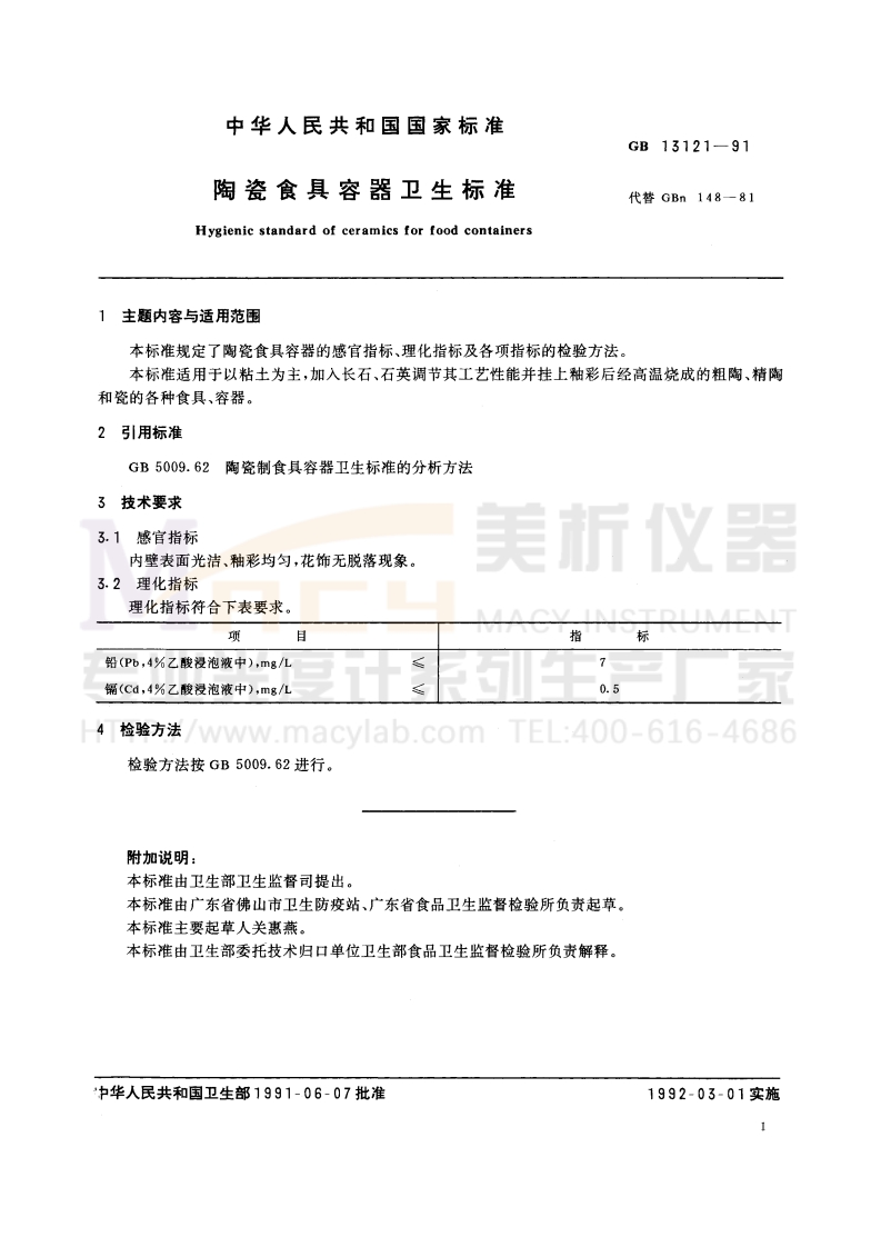 GB-13121-1991-陶瓷食具容器卫生标准348072@abc4个月前发布关注私信0.10MB2页022GB-13121-1991-陶瓷食具容器卫生标准此内容为付费资源,请付费后查看¥17¥23黄金会员免费钻石会员免费立即购买您当前未登录!建议登陆后购买,可保存购买订单付费资源 第1页 / 共2页 第2页 / 共2页 已完成全部阅读,共2页 THE END标准规范 文本预览 UDC666.51641.54:613.2c53GB中华人民共和国国家标准GB13121-91陶瓷食具容器卫生标准器Hygienic standard of ceramics for food containersINSTRUMENT专业光度计系列生产厂家HTTP://www.macylab.com TEL:400-616-46861991-06-07发布1992-03-01实施中华人民共和国卫生部发布 查看更多 收起部分 喜欢就支持一下吧收藏