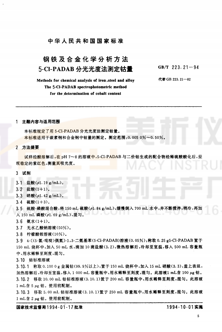 UDC669.14/.15:543H11中华人民共和国国家标准GB/T223.20223.22-94钢铁及合金化学分析方法电位滴定法测定钴量5-CI-PADAB分光光度法测定钴量TRU亚硝基R盐分光光度法测定钴量Methods for chemical analysis of iron,steel and alloyThe potentiometric titration method for//www.the determination of cobalt content00-616The 5-Cl-PADAB spectrophotometric methodfor the determination of cobalt contentThe nitroso-R-salt spectrophotometric methodfor the determination of cobalt content1994-01-17发布1994-10-01实施国家技术监督局发布