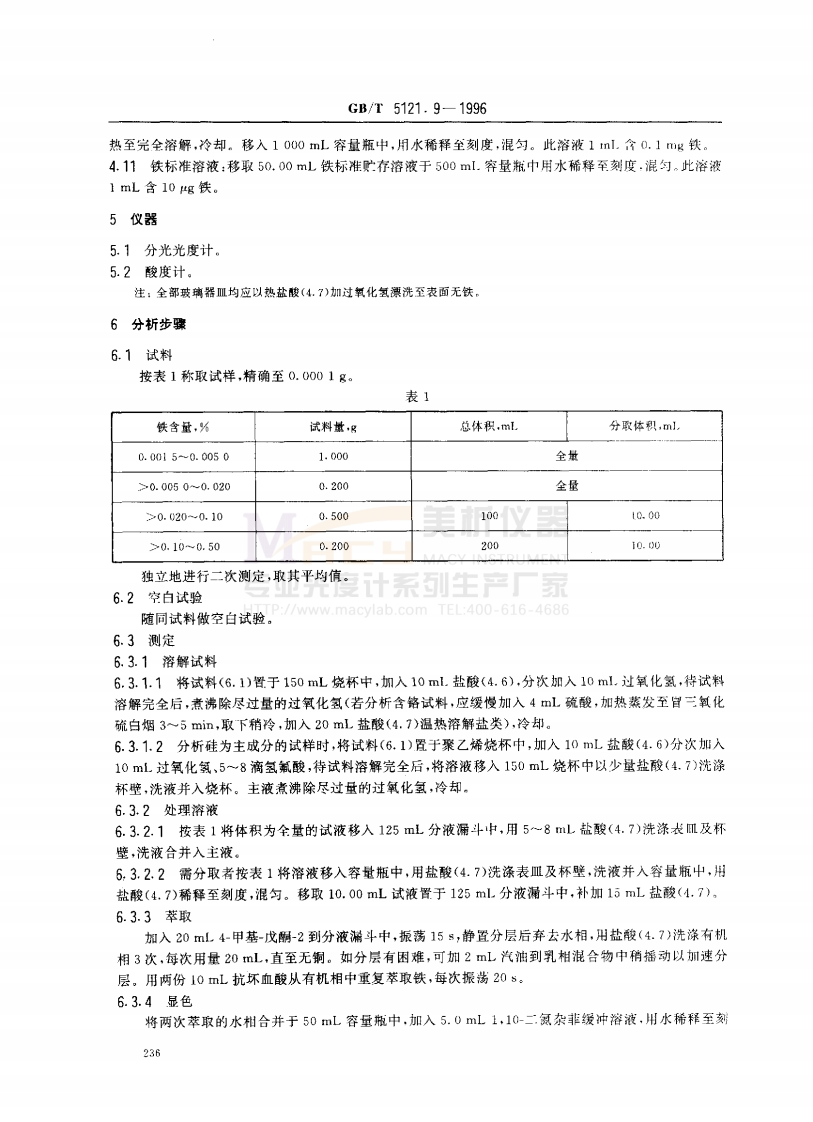 中华人民共和国国家标准GB/T5121.91996代楼G35121.983铜及铜合金化学分析方法铁量的测定B5122.38565122.1265B02.片·-87(136520.186Copper and copper alloys-Determination of iron content38550.17Gi38550.1687第一篇方法11,10二氨杂菲分光光度法测定铁量1范围本标准规定了铜及铜合金中铁含量的测量方法。木标准适用于铜及铜合金中铁含量的测定。测定范围:0.0015%0.50%。2引用标准下列标准所包含的条文,通过在本标准中引用而构成为本标准的条文。本标准山版时,所示版本均为有效。所有标准都会被修订,使用本标准的各方应保讨使用下列标准最新版本的可能性。GB1.4一88标准化工作导则化学分析方法标准编写规定(GB1167一78治金产品化学分析方法标准的总则及-一般规定GB772987冶金产品化学分析分光光度法通则INSTRUMENT3方法提要专光度生产厂家HTTP://www.macylab.com TEL:400-616-4686试料用盐酸及过氧化氯溶解,在约6mol/L盐酸介质中以1-甲基-戊酮-2萃取三价铁的氯化络合物,以抗坏血酸还原成二价铁并反萃取入水相,于分光光度计波长510m处测#铁(1)与1,1-.氮杂菲红色络合物的吸光度。4试剂4.14-甲基-戊酮-2。4.2汽油(沸点40~100C)。4.3硫酸(p1.84g/mL)。4.4氢氟酸(ol.13g/mL).4.5过氧化氢(30%)。4.6盐酸(7+3)。4.7盐酸(1+1).4.8抗坏血酸溶液(10g/L)。用时配制。4.91,10-二氮杂菲缓神溶液(2g1.):称取1.0g1,10-二氮杂菲(C2H.N:·H,O)600mL烧杯中,以5mL盐酸(4.7)溶解,加入215mL冰乙酸(pl.05gmL)混匀,在不断搅拌下缓慢加入265mL氨水(o0.91g/mL),冷却。此溶液的pH值应为6.5土0.1,如需要可用冰乙酸(1.05g/ml)或氨水(心.91g/ml)渊节,然后用水稀释到500ml,混匀。4.10铁标准贮存溶液:称取0.1000g纯铁发于150ml.烧杯中,加入20mL盐酸(p1.19g/ml.).加国家技术监督局1996-11-04批准1997.04-01实施235