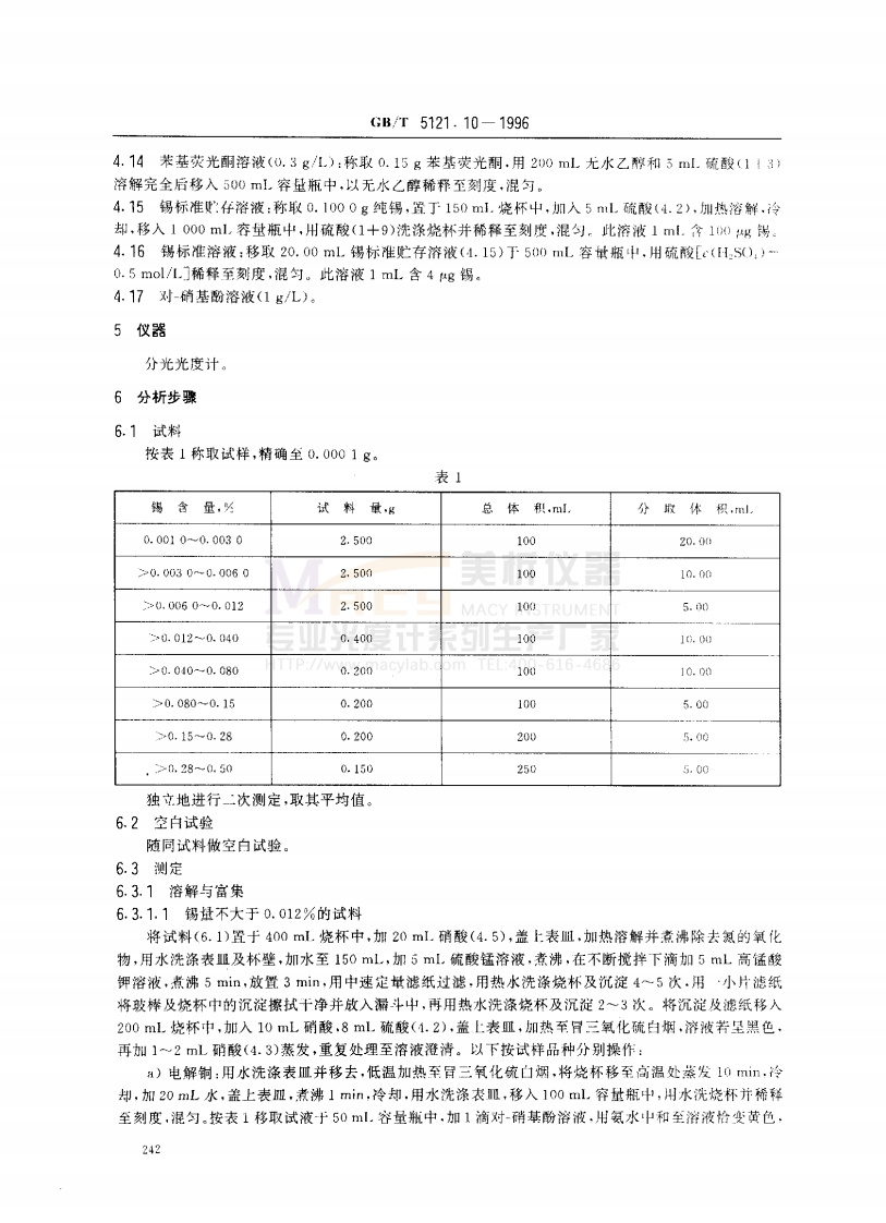 中华人民共和国国家标准GB/T5121.10-1996代格(B6】21.0铜及铜合金化学分析方法锡量的测定(55122.年55(5122.15s9(lH6520.566Copper and copper alloys-Determination of tin content(U8o02.2b71h85.0.1387第一篇方法1苯基荧光酮-聚乙二醇辛基苯基醚分光光度法测定锡量1范围本标准规定了铜及铜合金中锡含其的测量方法。本标准适用于铜及铜合金中锡含量的测定。测定范围:0.0010%~0.50%,2引用标准下列标准所包含的条文,通过在本标准中引用而构成为本标准的条文。本标准出版时,所示版本均为有效。所有标准都会被修订,使用本标准的各方应探讨使用下列标准最新版本的可能性。GB1.4一88标准化工作导则化学分析方法标准编写规定(GB1467一78冶金产品化学分析方法标准的总则及·般规定(出7729一87治金产品化学分析分光光度法通则NSTRUMENT3方法提要专业光宗到生产厂家/www.macylab.com TEL:400-616-4686根据试样的品种及含量,试料用硝酸、硫酸钾-硫酸或混合酸溶解,锡经水合二氧化最共沉淀宫集或直接在稀硫酸介质中与苯基荧光酮、聚乙二醇辛基苯基酸显色,于分光光度计波长5101处测址其吸光度。4试剂4.1硫酸钾。4.2硫酸(ol.81g/ml)。4.3硝酸(pl.42g/mL)。4.4氨水(o0.90g/mL).4.5硝酸(1十1)。4.6混合酸:在不断搅拌下向500mL水中加入300ml.硝酸(4.3)、200ml.硫酸(4.2).4.7硫酸锰(MnSO,·H0)溶液(50g/L)。4.8高锰酸钾溶液(10gL)。4.9疏酸[c(HS0,)=5mal/L]。4.10抗坏血酸溶液(10gL)。4.11酒石酸溶液(100gL)。4.12草酸(CH04·2H,O)溶液(1.3g/L)。4.13聚乙二醇辛基苯基醚溶液(5十95)。国家技术监督局1996-11-04批准1997.0401实施211