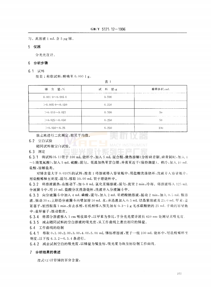 中华人民共和国国家标准GB/T5121.12-1996铜及铜合金化学分析方法锑量的测定代枚GB5121.1285i35122.178GB6523.4.86Copper and copper alloys-Determination of antimony content(B8002.857(158550.1+871范围本标准规定了铜及铜合金中锦含量的测量方法。本标准适用于铜及铜合金中锑含量的测定。测定范围:0.0010%~0.070%。2引用标准下列标准所包含的条文,通过在本标准中引用而构成为本标准的条文。本标准出版时,所示版木均为有效。所有标准都会被修订,使用本标准的各方应探讨使用下列标准最新版本的可能性。GB1.4一88标准化工作导则化学分析方法标准编写规定(GB1467一78冶金产品化学分析方法标准的总则及一般规定GB7729-87冶金产品化学分析分光光度法通则3方法提要MACY INSTRUMENT试料用混合酸溶解,疏酸冒烟并蒸发至近干。在盐酸介质中,五价绨的络阴离子与结晶紫所生成的络合物,用甲米*取,于分光光度计波长610nm处测量吸光度。-616-46864试剂4.1尤水碳酸钠。4.2甲苯。4.3氢氟酸(pl.13g/mL)。4.4混合酸:1单位体积盐酸(p1.19g/ml.)与1单位体积硝酸(p1.42g/ml.)混合。4.5盐酸(1+1).4.6硫酸(1十1)。4.7磷酸(1+1)。4.8氧化亚锡溶液(100gL):称取10g氧化亚锡(SClz·2HzO),置于250ml烧杯中,加入10ml.盐酸(4.5),微热溶解。用时现配。4.9亚硝酸钠溶液(100g儿),用时现配。4.10脲溶液(500g/L)。4.11结晶紫溶液(2g/L)。4.12锑标准贮存溶液:称取0.1000g纯锑于150mL烧杯中,加入20mL硫酸(l.84gmL),n热至完全溶解,冷却,移入1000mL容量瓶中。加入160mL硫酸(4.6),冷却,用水稀释至刻度,混)。此溶液1mL含0.1mg第。4.13镜标准溶液:移取5.00mL锑标准贮存溶液于100mL容量瓶中,用盐酸(4.5)稀释到刻度.混国家技术监瞥局1996,11-04批准1997·04-01实施251