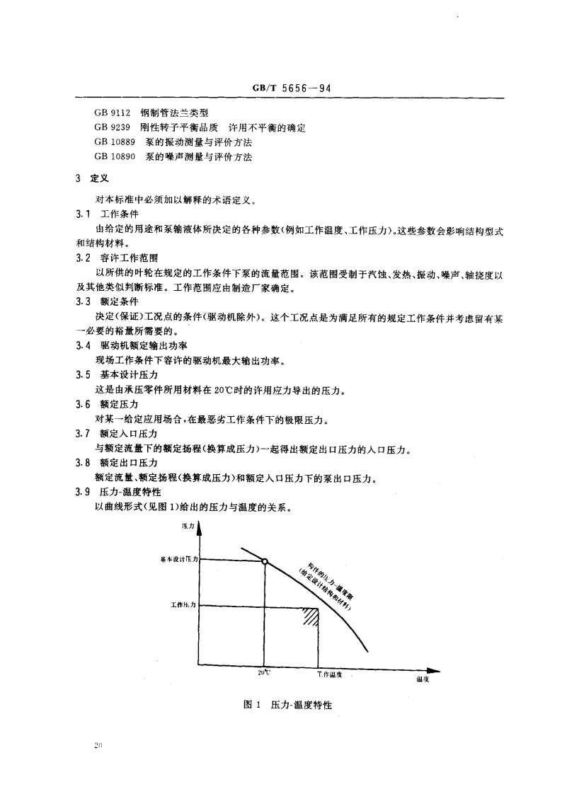 中华人民共和国国家标准离心泵技术条件(I类)GB/T5656-94Technical specifications for代替GB5656-85centrifugal pumps-Class I本标准等效采用国际标准IS05199一1986《离心泵技术条件一1类》。离心泵技术条件标准共有三个,按类别分为1、】、Ⅱ类。1类要求最严,避类要求最松。凡是可能需要由买方决定或需要由买方和制造厂家共同商定的内容,其有关正文用黑体字印刷并列出在附录H中。1主题内容与话用范围本标准规定了离心泵的设计制造,工厂检查和试验以及发运方面的Ⅱ类要求。并包含了与这些泵(含底座、联轴器和辅助管路,不包括驱动机)的安装、维护和安全有关的设计特性。本标准适用于化学和石油化学工业上使用的后开门结构的离心泵(典型的如符合GB5662所规定的泵)。本标准或标准的部分条款也适用于非后开门结构泵的设计。在已经要求应用本标准的情况下:a。又脂要一种特殊的设计特性时,可以提出符合本标准意图的另外一些供选择的设计,只要对它们作了详细的说明:b.可以提出并不完全符合本标准要求的泵供考虑,只要对所有不符合之点均予以说明。当多个文件之间含有相抵触的技术要求时,应按以下顺序决定各文件的适用性:a.购货订单或询问单(如无订单)〔见附录F(参考件)和附录G(参考件)门:b.数据表〔见附录A(参考件)):c.本标准;d.订单或询何单中提到的其他标准。2引用标准GB3216离心泵、混流泵,轴流泵和旋涡泵试险方法GB3767躁声源声功率级的测定工程法及准工程法GB3768噪声源声功率级的测定简易法GB4216灰铸铁管法兰尺寸GB4662滚动轴承额定静负荷GB5660轴向吸入离心泵底座尺寸和安装尺寸GB5661轴向吸入离心泵机械密封和软填料用的空腔尺寸GB5662轴向吸入离心泵(1.6MPa)标记,性能和尺寸GB6062轮廓法触针式表面粗糙度测量仪、轮廓记录仪及中线制轮廓仪GB6075制订机器振动标准的基础GB6391滚动轴承额定动负荷和额定寿命的计算方法国家技术监督局1994-08-29批准1995-07-01实施19