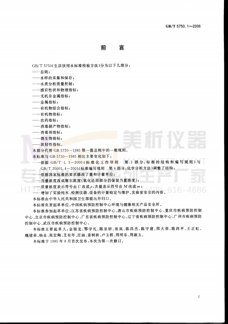 1CS13.060C51标准分享网免费标准下载站www.bzfxw.Com中华人民共和国国家标准GB/T5750.1-2006部分代替GB/T5750--1985生活饮用水标准检验方法总则Standard examination methods for drinking water-General principlesACY INSTRUMENT专业光度计系列生产厂家HTTP://www.macylab.com TEL:400-616-46862006-12-29发布2007-07-01实施中华人民共和国卫生部中国国家标准化管理委员会发布