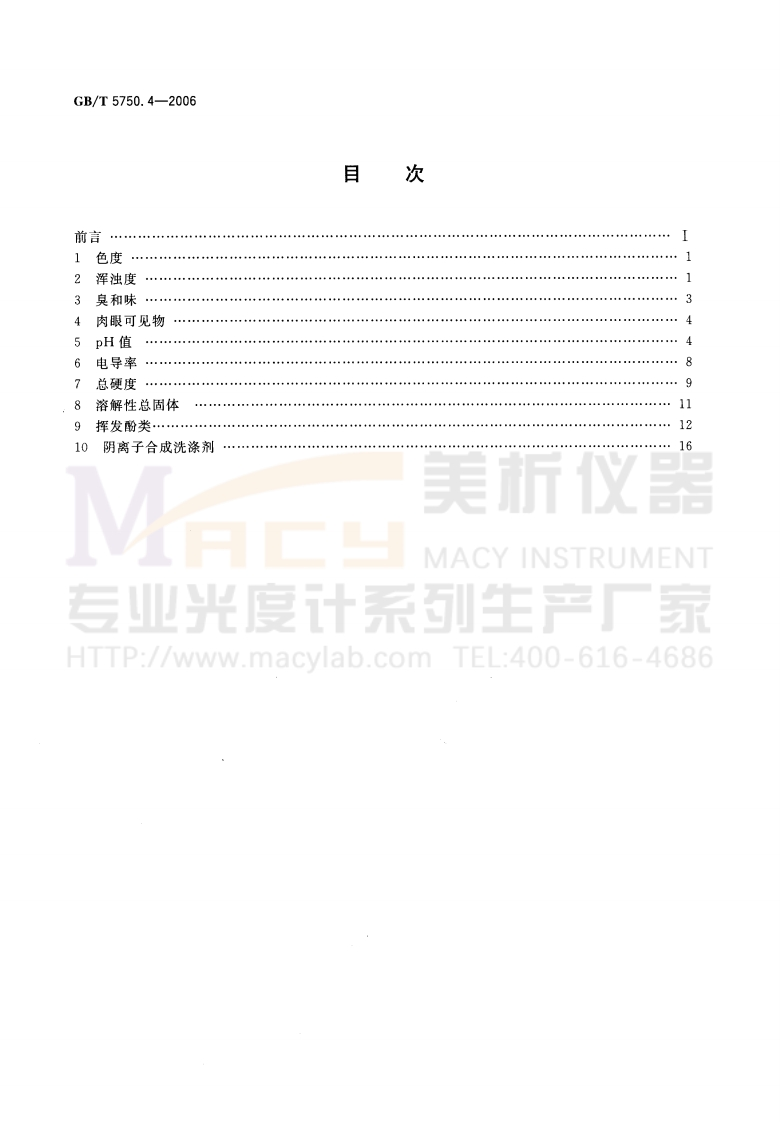ICS13.060C51GB中华人民共和国国家标准GB/T5750.4-2006部分代替GB/T5750一1985生活饮用水标准检验方法感官性状和物理指标Standard examination methods for drinking water专业光Organoleptic and physical parameters三厂家HTTP://www.macylab.com TEL:400-616-46862006-12-29发布2007-07-01实施中华人民共和国卫生部中国国家标准化管理委员会发布