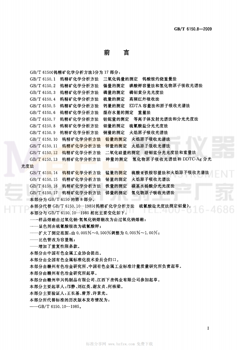 ICs77.120.99H63GB中华人民共和国国家标准GB/T6150.8-2009代替GB/T6150.10-1985钨精矿化学分析方法仪器钼量的测定硫氰酸盐分光光度法STRUMENTMethods for chemical analysis of tungsten concentrates-Determination of molybdenum content-WW The thiocyanate spectrophotometry00-616-46862009-10-30发布2010-06-01实施中华人民共和国国家质量监督检验检按总局中国国家标准化管理委员会发布