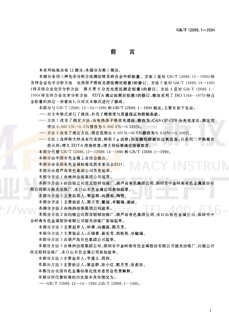 1CS77.040.30H13G中华人民共和国国家标准GB/T12689.1-2004代替GB/T12689.1一1990GB/T12689.13-1990GB/T12689.14-1990锌及锌合金化学分析方法铝量的测定铬天青S聚乙二醇辛基苯基醚-溴化十六烷基吡啶RUN分光光度法、CAS分光光度法和EDTA滴定法■The methods for chemical analysis of zinc and zinc alloys-The determination of aluminum content-The chromazurol S-polyethylene glycol octylphenylether-cetylpyridine bromine spectrophotometricmethod and the chromeazurol S spectrophotometricmethod and the EDTA titrimetric method2004-04-30发布2004-10-01实施中华人民共和国国家质量监督检验检疫总局中国国家标准化管理委员会发布