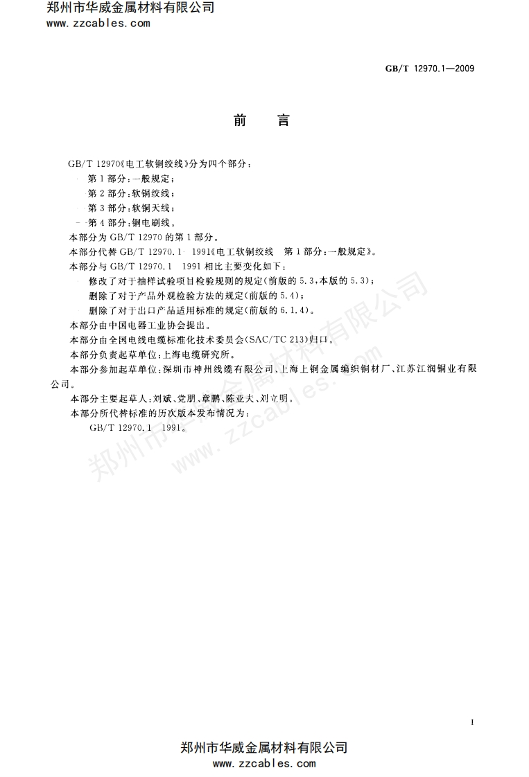 郑州市华威金属材料有限公司rww2.tcabjes.comK11GB中华人民共和国国家标准GB/T12970.1-2009代楼GB/T12970.1-1991电工软铜绞线限公司第1部分:一般规定Flexible copper stranded conductors for electrical purposes-Part 1:General requirements郑州市WWW.Z2009-03-19发布2009-12-01实施中华人民共和国国家质量监督检验检疫总局发布中国国家标准化管理委员会郑州市华威金属材料有限公司www.zzcables.com