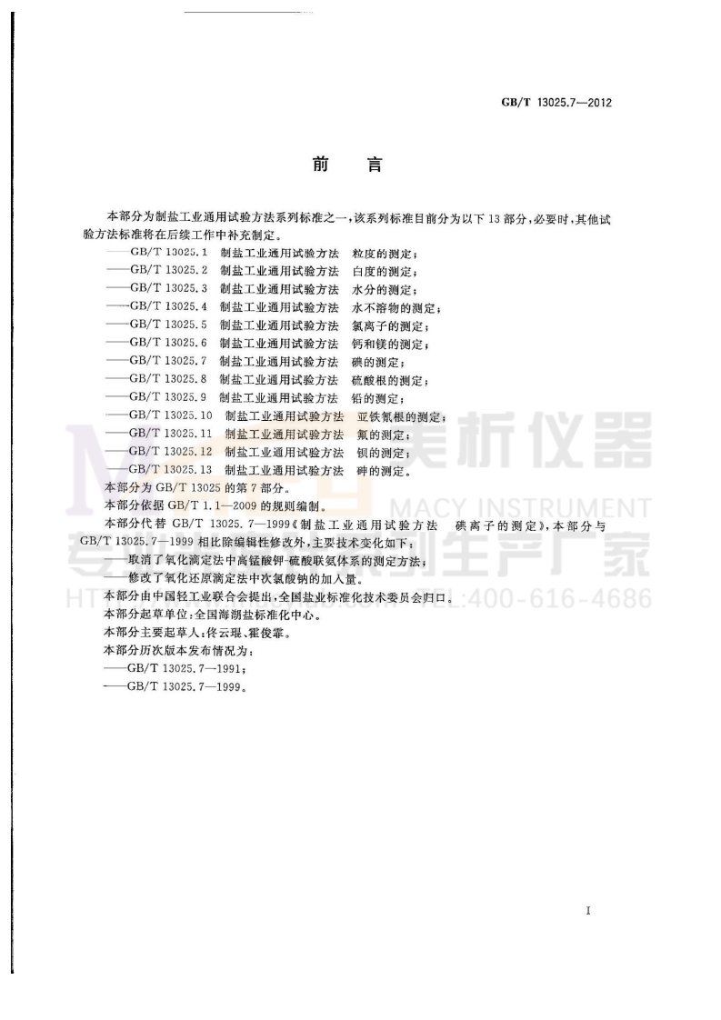 I【Cs71.060.50X35中华人民共和国国家标准GB/T13025.7-2012代替GB/T13025.7-1999制盐工业通用试验方法碘的测定General test method in salt industry-Determination of iodineMACY INSTRUMENT专业光度计系列生产厂家HTTP://www.macylab.com TEL:400-616-46862012-06-29发布2012-12-01实施中华人民共和国国家质量监督检验检疫总局中国国家标准化管理委员会发布