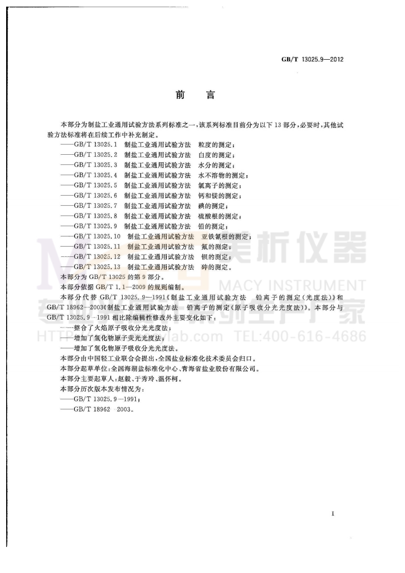 ICs71.060.50X35中华人民共和国国家标准GB/T13025.9-2012代替GB/T13025.9-1991,GB/T18962-2003制盐工业通用试验方法铅的测定General test method in salt industry-Determination of leadMACY INSTRUMENT专业光度计系列生产厂家HTTP://www.macylab.com TEL:400-616-46862012-06-29发布2012-12-01实施中华人民共和国国家质量监督检验检疫总局中国国家标准化管理委员会发布