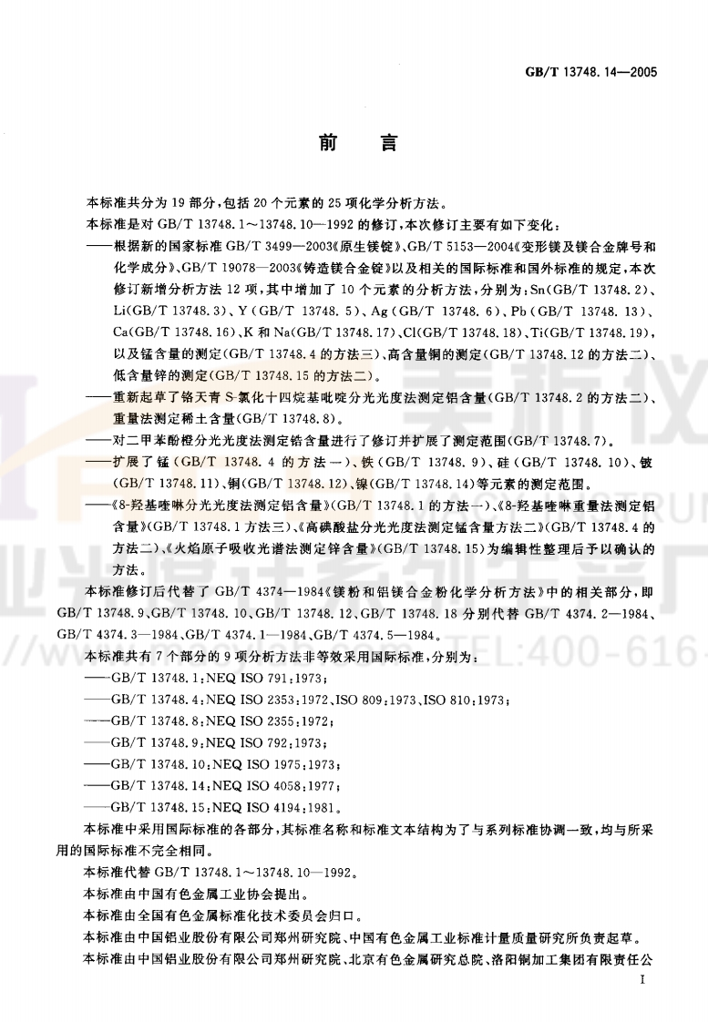 ICS77.120.20H12中华人民共和国国家标准GB/T13748.14-2005代替GB/T13748.9-1992镁及镁合金化学分析方法镍含量的测定丁二酮肟分光光度法INSTRUChemical analysis methods of magnesium and magnesium alloys-Determination of nickel content-Dimethylglyoxime trophotometric method//www.macylEL:400-616(NEQ ISO4058:1977)2005-07-26发布2006-01-01实施中华人民共和国国家质量监督检验检疫总局中国国家·标准化管理委员会发布