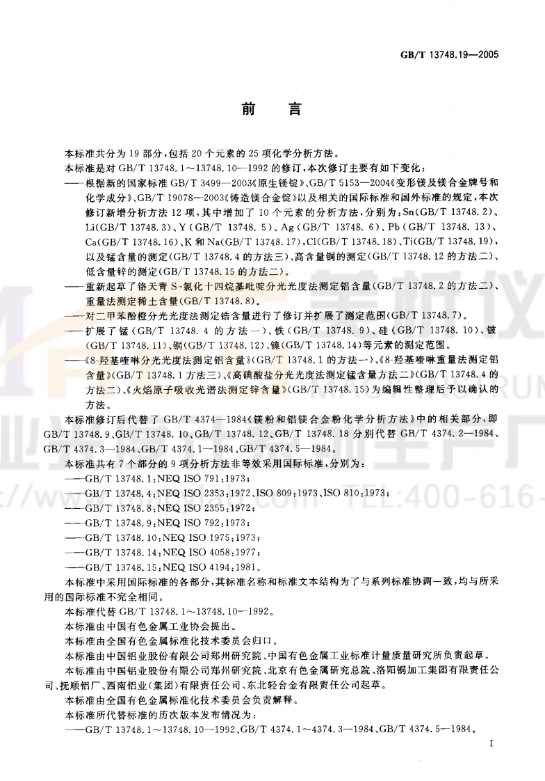 1CS77.120.20H12中华人民共和国国家标准GB/T13748.19—2005镁及镁合金化学分析方法钛含量的测定二安替比啉甲烷分光光度法STRUChemical analysis methods of magnesium and magnesium alloys-Determination of titanium content-Diantipyrylmethane spectrophotometric method//www.macyn00-6162005-07-26发布2006-01-01实施中华人民共和国国家质量监督检验检疫总局中国国家标准化管理委员会发布