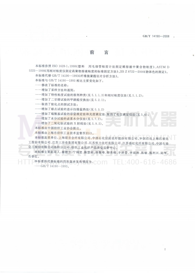 G250S359.060.01中华人民共和国国家标准GB/T14190-2008代替GB/T14190-1993纤维级聚酯切片(PET)试验方法Testing methods of fiber grade polyester chipMACY INSTRUMENT专业光度计系列生产厂家HTTP://www.macylab.com TEL:400-616-46862008-06-18发布2009-03-01实施中华人民共和国国家质量监督检验检疫总局中国国家标准化管理委员会发布效防伪