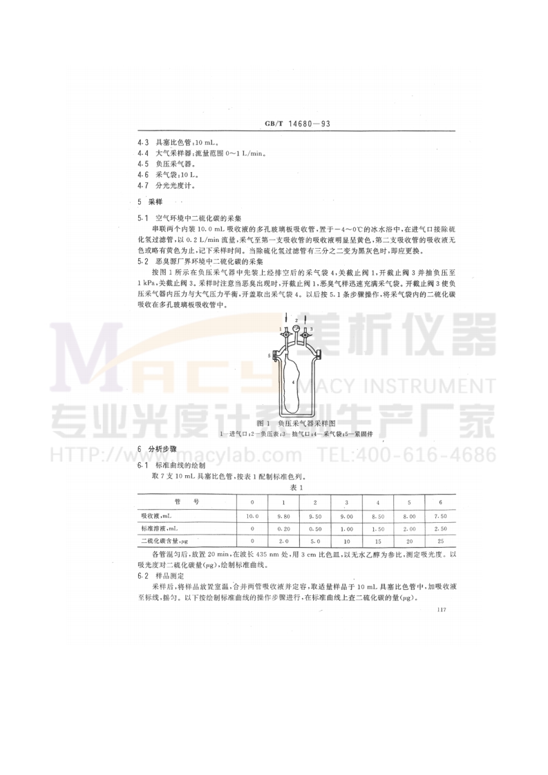 中华人民共和国国家标准空气质量二硫化碳的测定GB/T14680-93二乙胺分光光度法Air quality-Determination of carben disulfide-Diethylamine spectrophometric method1适用范围1,1本标准规定了恶臭源厂界环境及空气环境中二硫化碳的二乙胺分光光度测定法。1,2本标准适用于恶臭源厂界环境及环境空气中二硫化碳的测定。1.3本方法检出限为0.3g/10mL.,当采样体积为10~30L时,最低检出浓度为0.03mg/m1.4硫化氯与二硫化碳共存时十扰测定,可在采样时用乙酸铅棉过滤管排除2原理用含铜盐,二乙胺的乙醇溶液采样,在制高子存在下,二硫化碳与二乙胺作用,生成黄棕色的二乙基二统代氨基甲酸铜,于35nm波长处进行分光光度测定,试剂除非另有说明,分析时均使用符合国家标准的分析纯试剂和蒸馏水,CY|NSTRUME门T3.1乙酸铜乙醇溶液称址0.0500g乙酸铜,溶解于少量无水乙醇中,移入100mL容量瓶,并用无水乙醇稀释至标线。混匀。在冰箱内保存。3.2吸收液吸收乙酸铜-乙醇溶液(3.1)10mL于500mL容量瓶中,依次加入无水乙醇300mL,经新蒸馏提纯的二乙胺2.5mL及三乙醇胺2.5mL,用无水乙醇稀至标线。临用前配制。一HTT3化碳标准溶。1:400-616-4686在25mL容量瓶中加人无水乙醇约15mL,盖塞称重(精确至0.0001g),然后加入二硫化碳(优级纯)1~2滴,立即盖塞再称重(精确至0.0001g),用无水乙醇稀至标线,计算每毫升中二硫化碳的含量,临用时再用无水乙醇稀释成每毫升内含10g二硫化碳的标准溶液,3.4乙酸铅脱脂棉乙酸船脱脂棉制备方法:称取10g乙酸船溶解于90mL水中,加丙三醇10mL,搅拌均匀后将脱脂棉浸入,然后取出挤干,放在没有硫化氢污染的室内自然晾干,贮于广口瓶中备用。4仅器4.1除硫化氢过滤管:取内径为6~8mm,长为15cm左右的玻管,内装8一10cm用乙酸铅浸泡过的脱脂棉,排气端用少量棉花堵塞,两端密封保存。4.2多孔玻离吸收管:10mL。国家环境保护局1993-09-18批准1994-03-15实施116