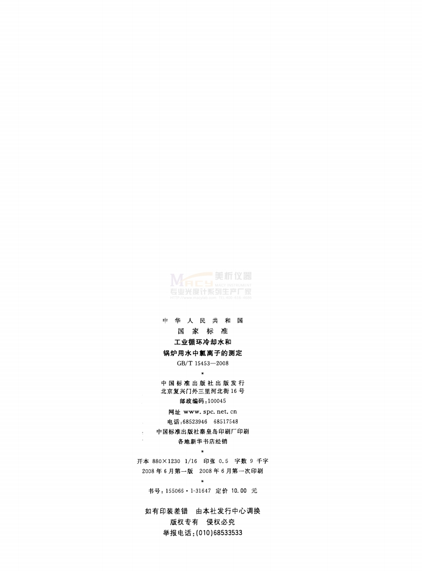 ICs71.040.40G76中华人民共和国国家标准GB/T15453-2008代替GB/T15453-1995,GB/T6905.1~6905.2-1986,GB/T6905.4-1993工业循环冷却水和锅炉用水中氯离子的测定析仪器Water for industrial circulating cooling system andboiler-Determination of chloride2008-04-01发布2008-09-01实施中华人民共和国国家质量监督检验检疫总局中国国家标准化管理委员会发布效码防伪
