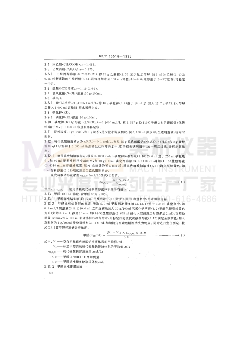 中华人民共和国国家标准空气质量甲醛的测定GB/T15516-1995乙酰丙酮分光光度法Air quality-Determination of formaldehyde-Acetylacetone spectrophotometric method1主题内容及适用范围1.1主题内容本标准规定了测定工业废气和环境空气中甲醛的乙酰丙酮分光光度法1.2适用范围12.1本方法适用于树脂制造、涂料、人造纤维、塑料,橡胶、染料、制药、油漆,制革等行业的排放废气,以及作医药消毒,防腐、熏蒸时产生的甲醛蒸气测定。1,2.2在采样体积为0.5~10.0L时,测定范围为0.5-~800mg/m1.2.3当甲醛浓度为20g/10ml时,共存8mg苯酚(400倍),10mg乙醛(500倍),600mg铵离子(30000倍)无干扰影响:共存S02,小于20g,N0,小于50g,甲醛回收率不低于95%。2原理甲竖气体经水吸收后,在pH=6的乙酸-乙酸铵缓冲溶液中,与乙酰丙酮作用,在沸水浴条件下,迅速生成稳定的黄色化合物,在波长413m处测定,反应式如下专光HCH+NH,2LCH,6 CH,CHCH,HTTP://www.macacH,-c-cH,+3H000-616-46863试剂除非另有说明,分析时均使用符合国家标准的分析纯试剂和按3.1条制备的水3.1不含有机物的蒸馏水。加少量高锰酸钾的碱性溶液被于水中再行蒸馏即得(在整个蒸馏过程中水应始终保持红色,否则应随时补加高锰酸钾),3.2吸收液:不含有机物的重燕馏水(3.1).3.3乙酸筱(NH,CH,COO).国家环境保护局1995-03-15批准1995-08-01实施127