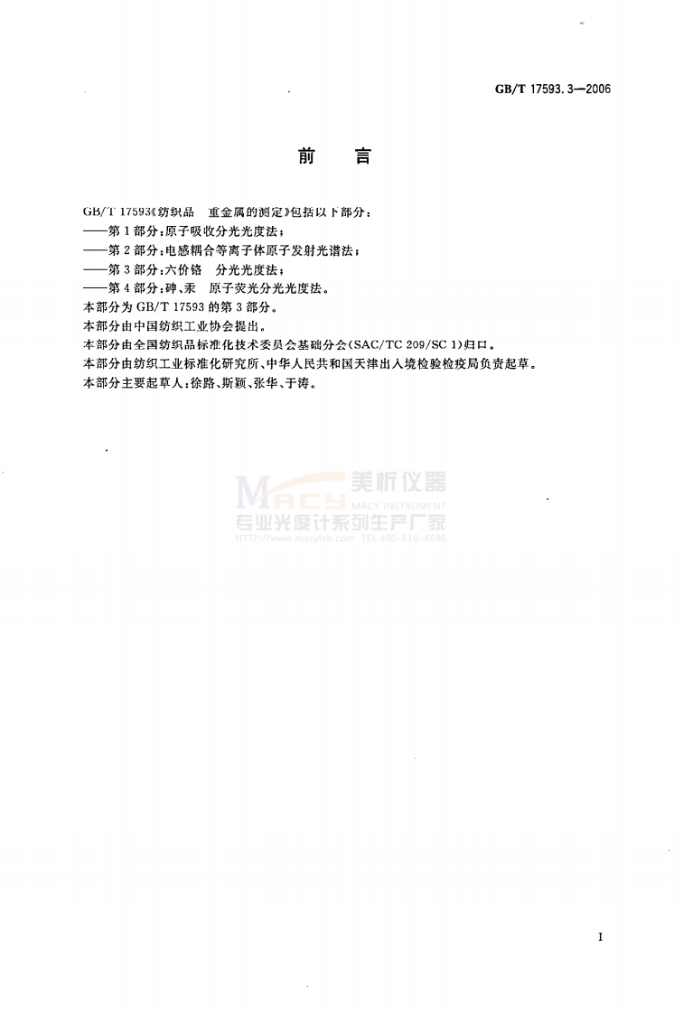 GBT-17593.3-2006-纺织品-重金属的测定-第3部分六价铬-分光光度法348072@abc2个月前发布关注私信0.16MB6页031GBT-17593.3-2006-纺织品-重金属的测定-第3部分六价铬-分光光度法此内容为付费资源,请付费后查看¥17¥23黄金会员免费钻石会员免费立即购买您当前未登录!建议登陆后购买,可保存购买订单付费资源 第1页 / 共6页 第2页 / 共6页 试读已结束,还剩4页,您可下载完整版后进行离线阅读 THE END标准规范 文本预览 1CS59.080.01W04中华人民共和国国家标准GB/T17593.3-2006纺织品重金属的测定第3部分:六价铬分光光度法Textiles-一Determination of heavy metals一Part 3:Chromium(V)-Spectrophotometry2006-05-25发布2006-12-01实施中华人民共和国国家质量监督检验检疫总局中国国家标谁化管理委员会发布T数新府 查看更多 收起部分 喜欢就支持一下吧收藏