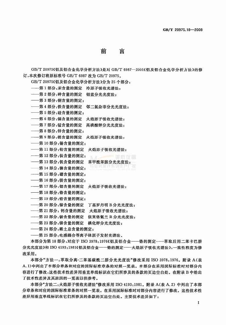 ICS77.120.10H12GB中华人民共和国国家标准GB/T20975.18-2008代替GB/T6987.30-2001,GB/T6987.18-2001铝及铝合金化学分析方法第18部分:铬含量的测定Methods for chemical analysis of aluminium and aluminium alloys-Part 18:Determination of chromium content2008-03-31发布2008-09-01实施中华人民共和国国家质量监督检验检疫总局中国国家标准化管理委员会发布