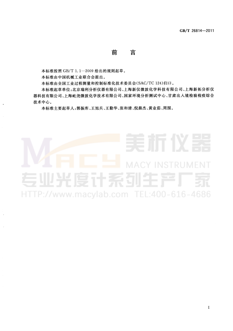 GBT-26814-2011-微波消解装置348072@abc2个月前发布关注私信0.91MB13页029GBT-26814-2011-微波消解装置此内容为付费资源,请付费后查看¥17¥23黄金会员免费钻石会员免费立即购买您当前未登录!建议登陆后购买,可保存购买订单付费资源 第1页 / 共13页 第2页 / 共13页 试读已结束,还剩11页,您可下载完整版后进行离线阅读 THE END标准规范 文本预览 1CS71.040.10N61GB中华人民共和国国家标准GB/T26814-2011微浪消解装置义器Microwave digestion equipmentMACY INSTRUMENT业光度计系列生产厂家HTTP://www.macylab.com TEL:400-616-46862011-07-29发布2011-12-01实施中华人民共和国国家质量监督检验检疫总局发布中国国家标准化管理委员会 查看更多 收起部分 喜欢就支持一下吧收藏