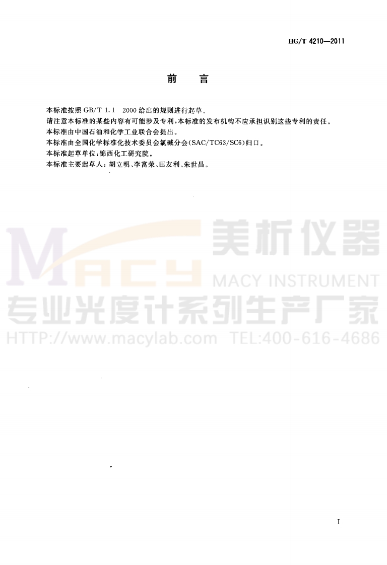 ICs71.060.50G13备案号:34611一2012HG中华人民共和国化工行业标准HG/T4210-2011工业用三氯化磷一铁含量的测定分光光度法RUMENTPhosphorus trichloride for industrial use-determination ofiron content-spectrophotometric methodHTTP://www.macylab.com TEL:400-616-46862011-12-20发布2012-07-01实施中华人民共和国亡业和信息化邵发布