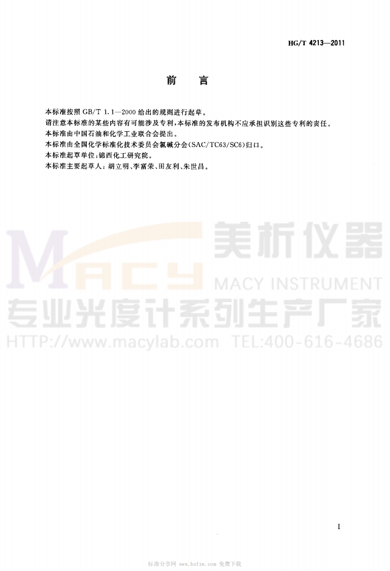 1Cs71.060.50G13备案号:34614一2012HG中华人民共和国化工行业标准HG/T4213-2011工业用三氯氧磷一铁含量的测定分光光度法Phosphorus oxychloride for industrial use-determination ofUMENT专光米工iron content-spectrophotometric method产厂家HTTP://www.macylab.com TEL:400-616-46862011-12-20发布2012-07-01实施中华人民共和国工业和信息化部发布