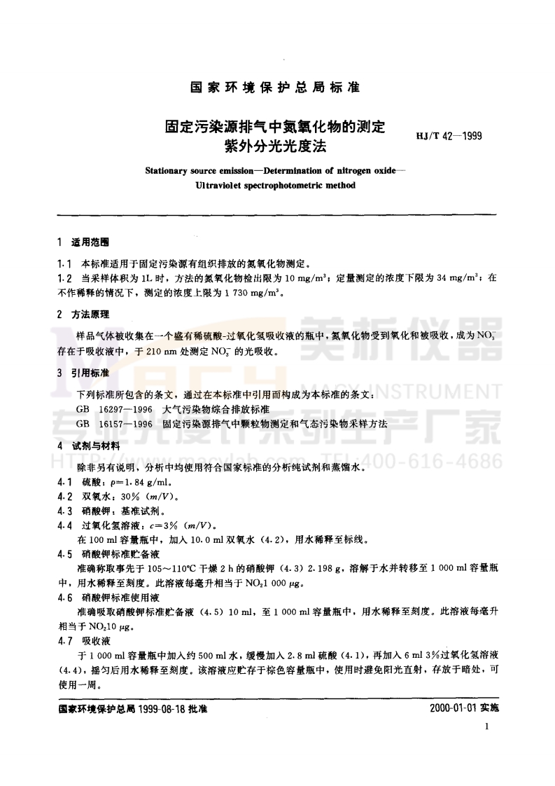 HJ国家环境保护总局标准HJ/T42一1999固定污染源排气中氮氧化物的测定紫外分光光度法Stationary source emission-Determination of nitrogen oxide-Ultraviolet spectrophotometric methodNSTRUMENT专亚光度计系列生产厂家HTTP://www.macylab.com TEL:400-616-4686199908-18发布2000-01-01实施国家环境保护总局发布