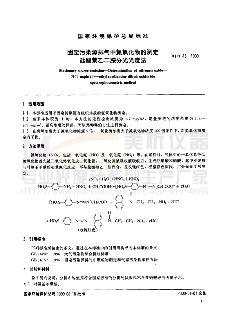 HJ国家环境保护总局标准HJ/T43-1999固定污染源排气中氮氧化物的测定盐酸萘乙二胺分光光度法Siationary source emissionDetermination of nitrogen oxidN(1-naphtye)-ethylenediamine dihydrochloride专业光r生产厂家spectrophotometric methodHTTP://www.macylab.com TEL:400-616-46861999-0818发布2000-01-01实施国家环境保护总局发布