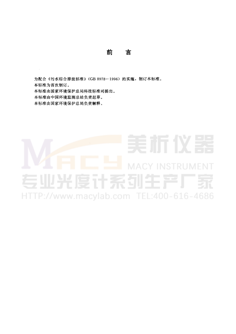 HJ国家环境保护总局标准HJ/T58-2000水质铍的测定铬菁R分光光度法仪器Water quality-Determination of beryllium-Spectrophotometricmethod with erichrome cyanine RNSTRUMENT专业光度计系列生产厂家HTTP://www.macylab.com TEL:400-616-46862000-12-07发布2001-03-01实施国家环境保护总局发布
