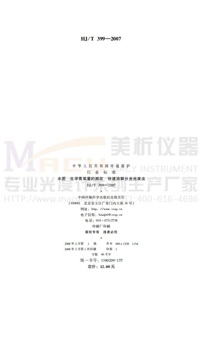 中华人民共和国环境保护行业标准HU/T399-2007水质化学需氧量的测定快速消解分光光度法仪器Water quality-Determination of the chemical oxygen demand-Fast digestion-spectrophotometric methodSTRUMENT专业光度计系列生产厂家HTTP://www.macylab.com TEL:400-616-46862007-12-07发布2008-03-01实施国家环境保护总局发布