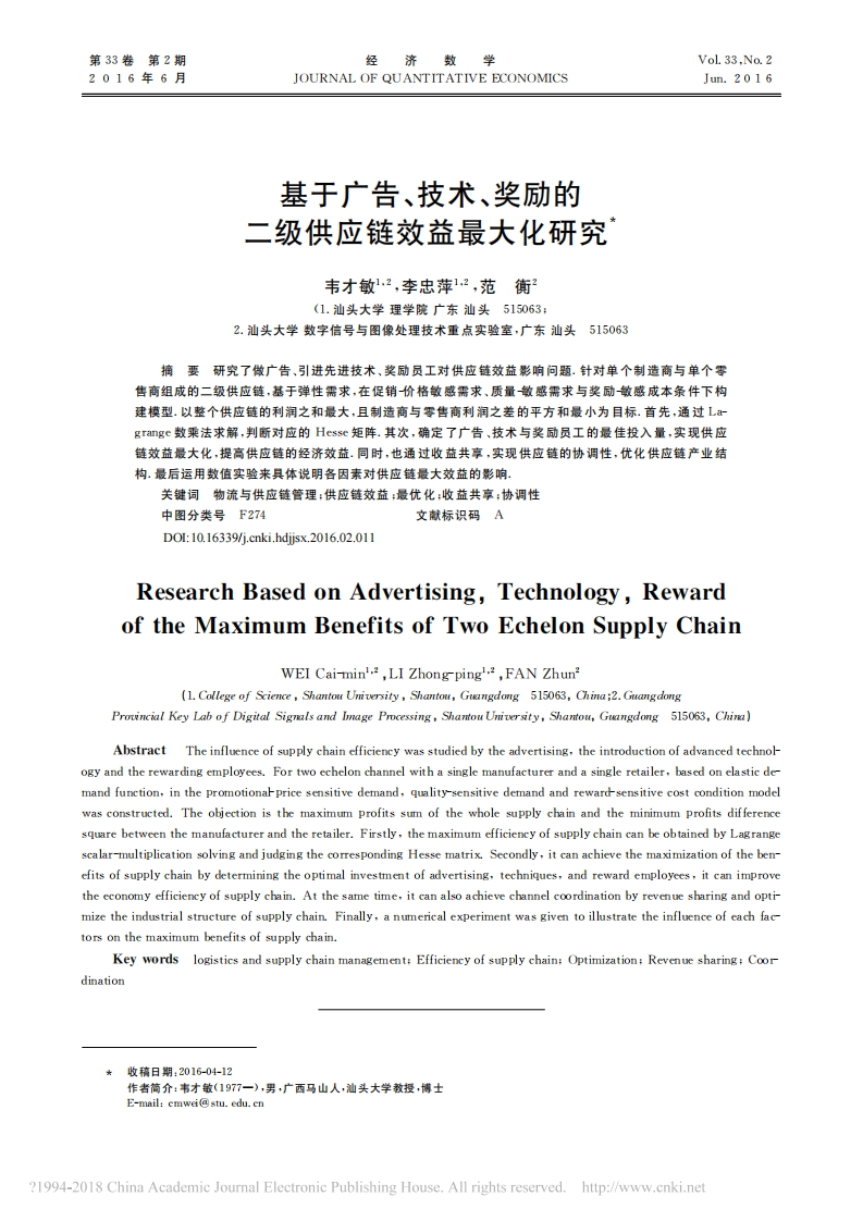 ResearchGateResearch based on advertising,technology,reward of the maximum benefitsof two echelon supply chainArticle-June 2016CTATIONSREADS0593 authorsCaimin WeiZhongping LiShantou UniversityAnhuiUniversity变EPRO厘LESEE PRORLEZhun FanShantou University交E PRORLESome of the authors ofthis publication are also working on these related projectsinventory control View projectscheduling withlearning efect View projectThiusr hasragasad anhancemnt ofthe downloaded file