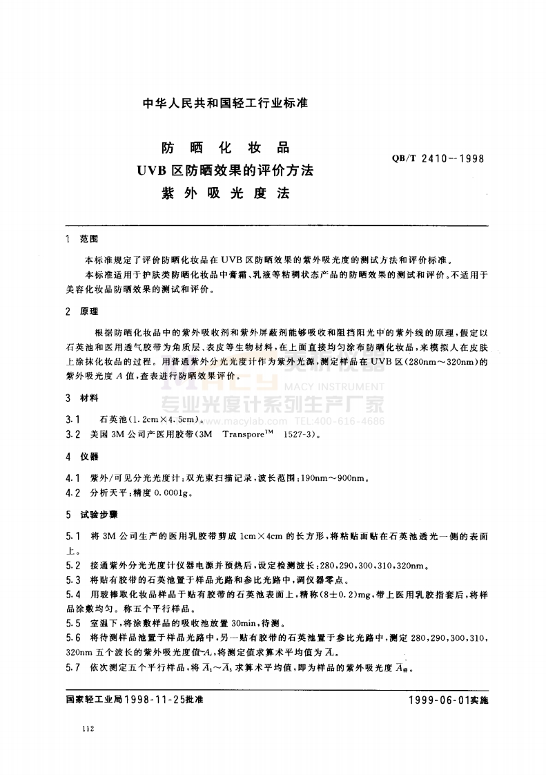 QB/T2410-1998前言对于防晒化妆品防晒性能的研究,国外始于70年代,有使用人体,动物和仪器测定的评价方法,有的国家还把这些方法列为国家标准或法规,我国近年来也有单位进行这方面的研究,但没有形成统一的方法标准.为了促进我国化妆品工业的发展,进一步规范防晒化妆品市场的管理并和国际上有关标准法规接轨,根据我国国情制定了本方法标准用来评价防晒化妆品的防晒性能和效果。本标准根据防晒化妆品中的紫外吸收剂和紫外屏蔽剂能够吸收和阻挡阳光中紫外线的原理,假定以石英池和医用透气胶带为角质层、表皮等生物材料,在上面直接均匀涂布防晒化妆品,模拟人在皮肤上涂抹化妆品的过程。使用普通紫外分光光度计为紫外光源,测定样品在UVB区(280nm~320如m)的紫外吸光度A值,通过比较样品的吸光度的大小,判断样品对紫外线UVB区的防护效果。由于定义概念的不同,不应将本标准评价方法用于产品SP℉值的测定。本标准由国家轻工业局行业管理司提出本标准由全国化妆品标准化中心归口,本标准起草单位:北京市日用化学研究所。本标准主要起草人:杜小素、徐卫。美析仪器MACY INSTRUMENT专业光度计系列生产厂家HTTP://www.macylab.com TEL:400-616-4686111