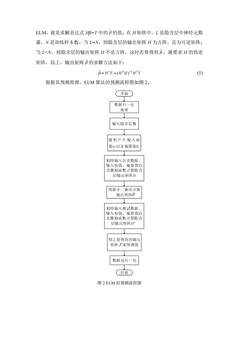 极限学习机预测原理极限学习机(Extreme Learning Machine,ELM)的结构网络如图1所示,假设有N个不同的样本(X,),其中X,=[s1,x2,xn]了∈R”,1=[,2,,1了∈R”,对于隐含层的节点个数为L的单隐层前馈神经网络,其网络表达式可表示为:BgW·X,+b,)=0,j=12,N(1)0输入层输出层图1ELM结构网络图其中,g(x)为激励函数;形,=[w,w2,,wm]了为输入层神经元与隐含层神经元的连接权值,即输入权重:b为隐含层节点偏移值:B为隐含层神经元与输出层神经元的连接权值,即输出权重;o为预测输出。ELM样本训练以网络输出值与样本值间的误差最小为目标,即2,-o(2)存在系数矩阵B,W,b,使得2BgWX,+b)=4,j=12,N(3)即HB=T(4)「g(wx+b)…8(wx+b)其中:H=为隐含层的输出矩阵,B为输出权g(wxx+)…8(WLxx+b)重矩阵,T为ELM的期望输出。对于已产生输入权重值",和隐含层节点偏移值b,的ELM而言,训练一个