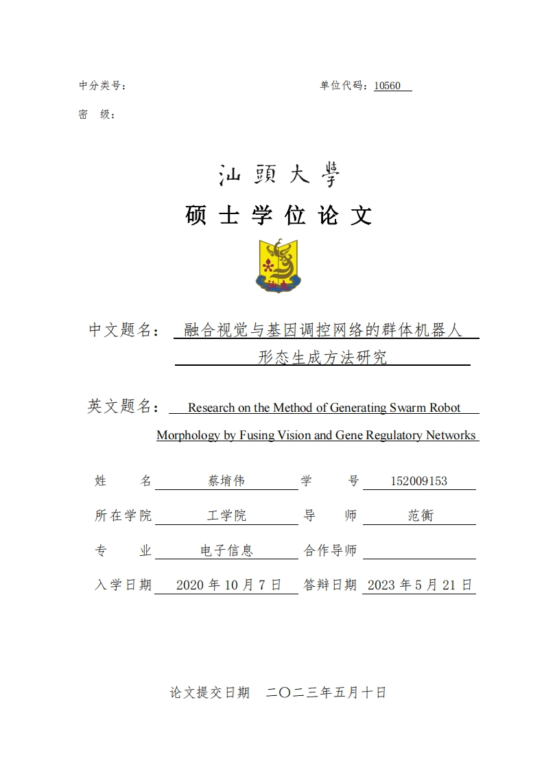 中分类号:单位代码:10560密级:汕頭大婆硕士学位论文中文题名:融合视觉与基因调控网络的群体机器人形态生成方法研究英文题名:Research on the Method of Generating Swarm RobotMorphology by Fusing Vision and Gene Regulatory Networks姓名蔡堉伟号152009153所在学院工学院导师范衡专业电子信息合作导师入学日期2020年10月7日答辩日期2023年5月21日论文提交日期二O二三年五月十日