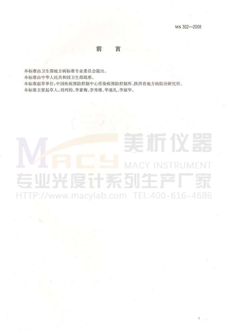 Ics11.020c6124833-2008WS中华人民共和国卫生行业标准WS302-2008食物中碘的测定砷铈催化分光光度法Method for determination of iodine in foodstuff byAs(III)-Ce#catalytic spectrophotometryMACY INSTRUMENT专亚光度计系列生产厂家HTTP://www.macylab.com TEL:400-616-46862008-08-06发布2009-02-01实施©人足典息PM P H中华人民共和国卫生邵发布是水酒天