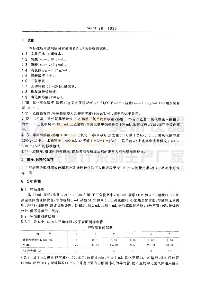 中华人民共和国卫生行业标准尿中砷的二乙基二硫代氨基甲酸银三乙醇胺分光光度测定方法WS/T28-1996Urine-Determination of arsenic-Silverdiethyldithiocarbamate-triethanolamine-Spectrophotometric method1主题内容与适用范围本标准规定了尿中砷的分光光度测定方法。本法最低检测浓度为0.025mgL。本标准适用于正常人和接触砷化物工人尿中砷含量的测定。2原理析仪器尿样经硫酸-硝酸-高氯酸消化后,在碘化钾和酸性氯化亚锡存在下,使五价砷还原成三价砷,然后与新生态氢反应,生成砷化氢气体,该气体吸收于二乙基二疏代氨基甲酸银(DDC-Ag)-三乙醇胺的三氯甲烷溶液中,生成红色络合物,比色定量。3仪器计系列生产厂家3.1砷化氢发生装置,见下图。3.2分光光度计,1omm比色杯.cyab.C0mTEL:400-616-46863.3聚乙烯瓶或玻璃瓶,100mL.。3.4尿比重计。砷化氢发生器&一150mL三角烧瓶;b一磨口塞;c一乙酸铅脱脂棉:d一聚乙烯塑料管,e一玻璃导管:f一刻度离心管g一吸收液h一样品中华人民共和国卫生部1996-10-14批准1997-05-01实施