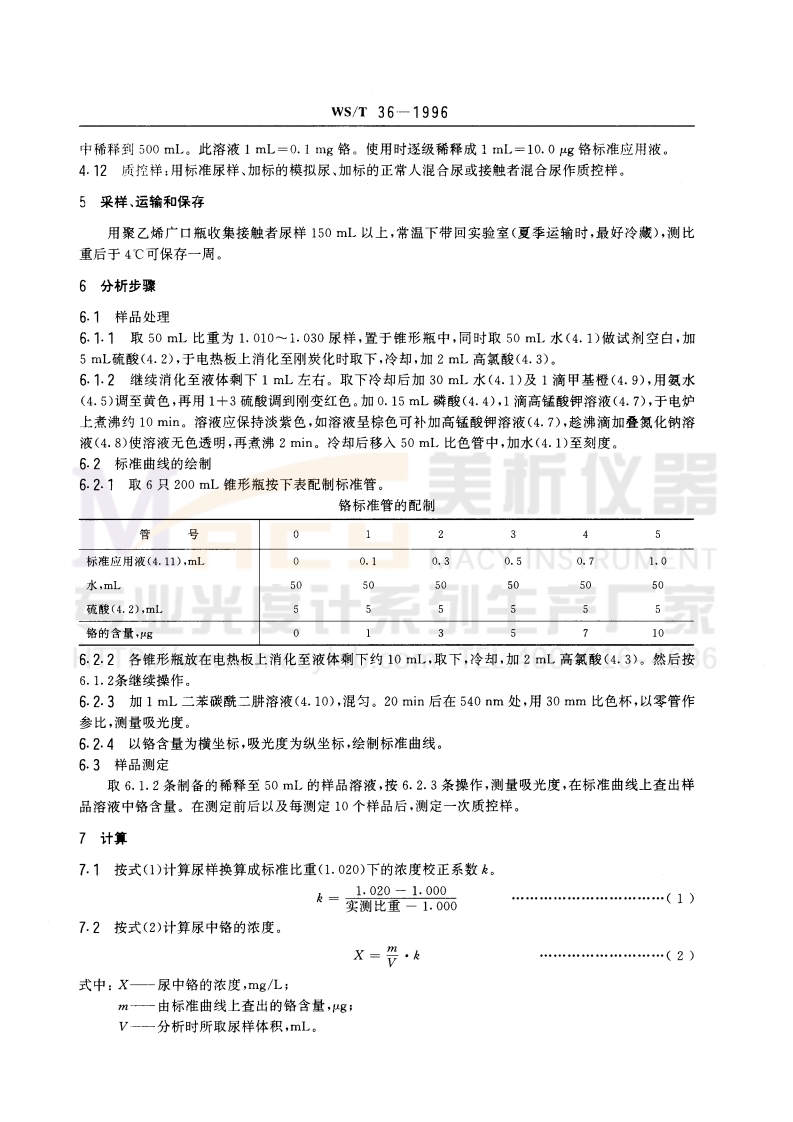 中华人民共和国卫生行业标准尿中铬的分光光度测定方法WS/T36-1996Urine-Determination of chromium-Spectrophotometric method1主题内容与适用范围本标准规定了尿中铬的分光光度测定方法。本法最低检测浓度为0.008mg/L。本标准适用于接触铬及铬盐工人尿中铬浓度的测定。2原理尿样经酸消化后,在酸性条件下,用高锰酸钾将三价铬氧化为六价铬,六价铬与二苯碳酰二肼生成紫红色铬合物,在波长540nm处比色定量。3仪器MACY INSTRUMENT3.1分光光度计,30mm比色杯。3.2具塞磨口比色管,50mL。3.3锥形瓶,200mL。计系列生产厂家3.4电热板。3.5聚乙烯塑料瓶。W.nacylab.com TEL:400-616-46863.6尿比重计。4试剂本标准所用试剂除另有说明者外,均为分析纯试剂。4.1实验用水:蒸馏水或同等纯度的去离子水。4.2硫酸,po=1.84g/mL。4.3高氯酸,po=1.67g/mL。4.4磷酸,P0=1.68g/mL。4.5氨水,P20=0.90g/mL。4.61+3硫酸溶液。4.7高锰酸钾溶液,30g/L。4.8叠氨化纳溶液,5g/L。4.9甲基橙溶液,1g/L。4.10二苯碳酰二肼溶液,0.4g/L:称取0.1g二苯碳酰二肼溶于50mL95%(VV)乙醇中,再加入200mL1十9硫酸,摇匀。贮存于棕色瓶中,于冰箱保存,可使用一个月。4.11铬标准溶液:称取120℃干燥至恒重的基准重络酸钾(KCr0,)0.1415g,用水溶解,移入容量瓶中华人民共和国卫生部1996-10-14批准1997-05-01实施