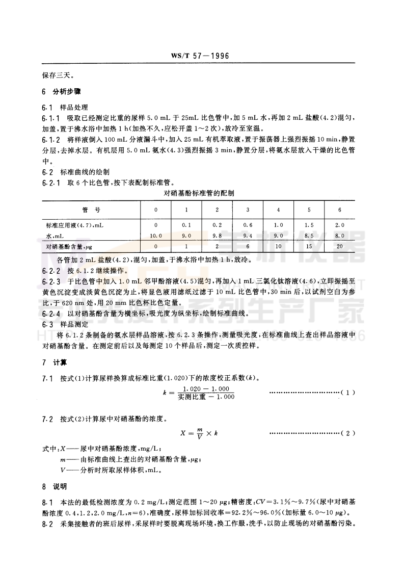 中华人民共和国卫生行业标准尿中对硝基酚的分光光度测定方法Ws/T57-1996Urine-Determination of 4-nitrophenol-Spectrophotometric method1主题内容与适用范围本标准规定了尿中对硝基酚的分光光度测定方法。本法最低检测浓度为0.2mgL。本标准适用于接触硝基苯类化合物工人尿中对硝基酚含量的测定。2原理尿中对硝基酚以游离形式或与葡萄糖醛酸、疏酸等结合存在,尿样经水解后,结合的对硝基酚转化为游离形式,用有机溶剂萃取对硝基酚,再反萃取至氨水中,用三氯化钛将对硝基酚还原成对氨基酚,与邻甲酚作用,生成靛酚蓝,于波长620nm处比色定量。3仪器3.1分光光度计,20mm比色杯。MACY INSTRUMENT3.2比色管,25mL,10mL,具磨口塞。3.3水浴锅,100℃。3.4分液漏斗,100mL十系列生产厂家3.5聚乙烯塑料瓶,50mL以上。3.6尿比重计.Www.macylab.com TEL:400-616-46864试剂本标准所用试剂除另有说明外,均为分析纯试剂。4.1实验用水,蒸馏水或具有同等纯度的去离子水。4.2盐酸,P20=1.19g/mL。4.3氨水,3mol/L。取浓氨水50mL加水稀释至250mL。4.4有机溶剂萃取液:1%(V/W)异戊醇溶液(溶剂为4+1石油醚和乙醚的混合物)。4.5邻甲酚溶液,20gL,称取邻甲酚2g,溶于100mL0.2mol/L氢氧化钠中。4.6三氯化钛溶液:取150~200g/L的三氯化钛溶液1mL,加蒸馏水至8mL,临用前配制。4.7对硝基酚标准溶液:称取0.1000g对硝基酚登于小烧杯中,用氨水(4.3)溶解,转移至100mL容量瓶中,加氨水(4.3)至刻度,此液1mL相当于1mg对硝基酚,为贮备液,取此液用氨水(4.3)稀释成1ml相当于10g对硝基酚的应用液。4.8质控样:用加标的模拟尿、接触者混合尿或加标的正常人混合尿作质控样。5采样、运输和保存用聚乙烯瓶采集接触者班后尿样50mL以上。每100mL加3滴甲醛,或将尿样置于4℃冰箱中可中华人民共和国卫生部1996-10-14批准1997-05-01实施