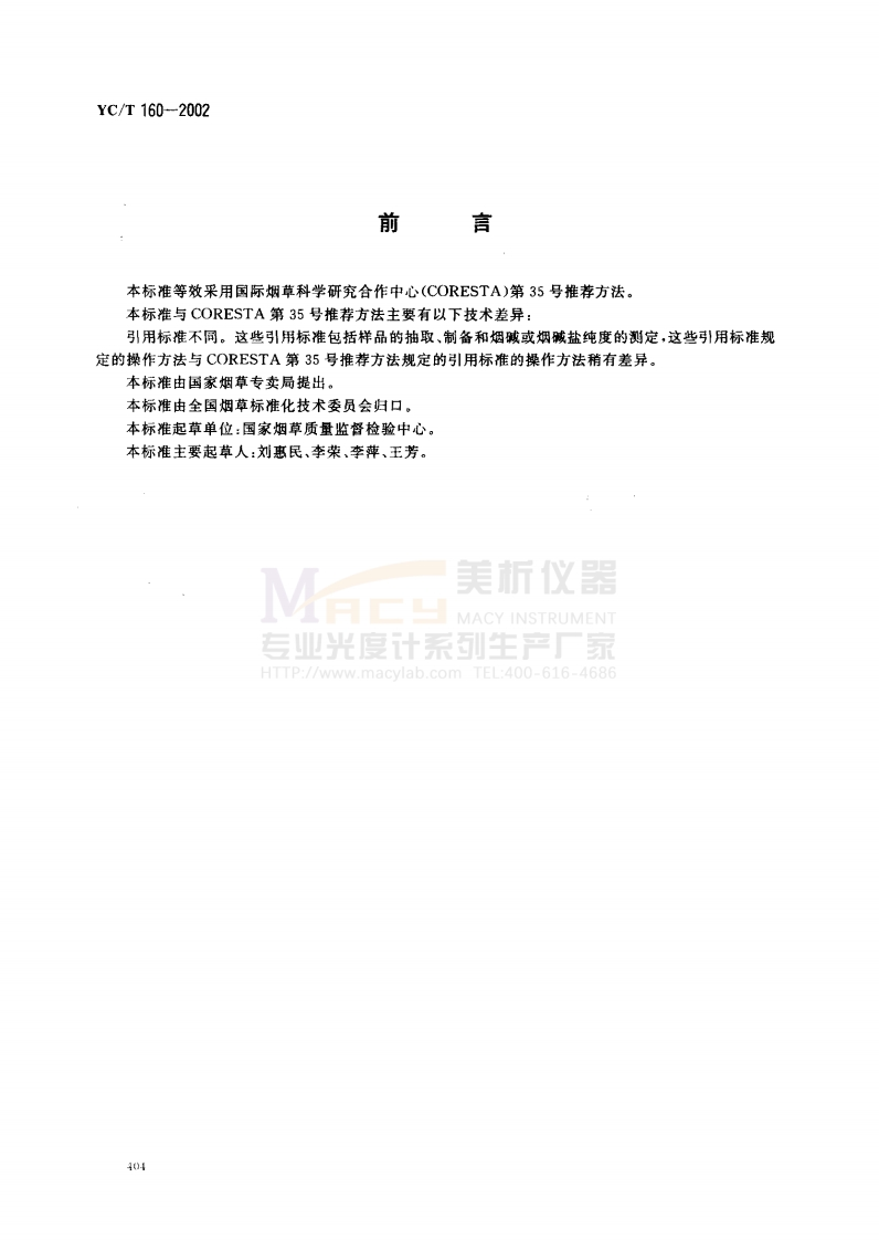 1Cs65.160X87备案号:10590-2002YG中华人民共和国烟草行业标准YC/T160-2002烟草及烟草制品总植物碱的测定连续流动法Tobacco and tobacco products-Determination of total alkaloids-Continuous flow methodHTTP://www.macylab.co400-616-46862002-09-12发布2002-12-01实施国家烟草专卖局发布4D3