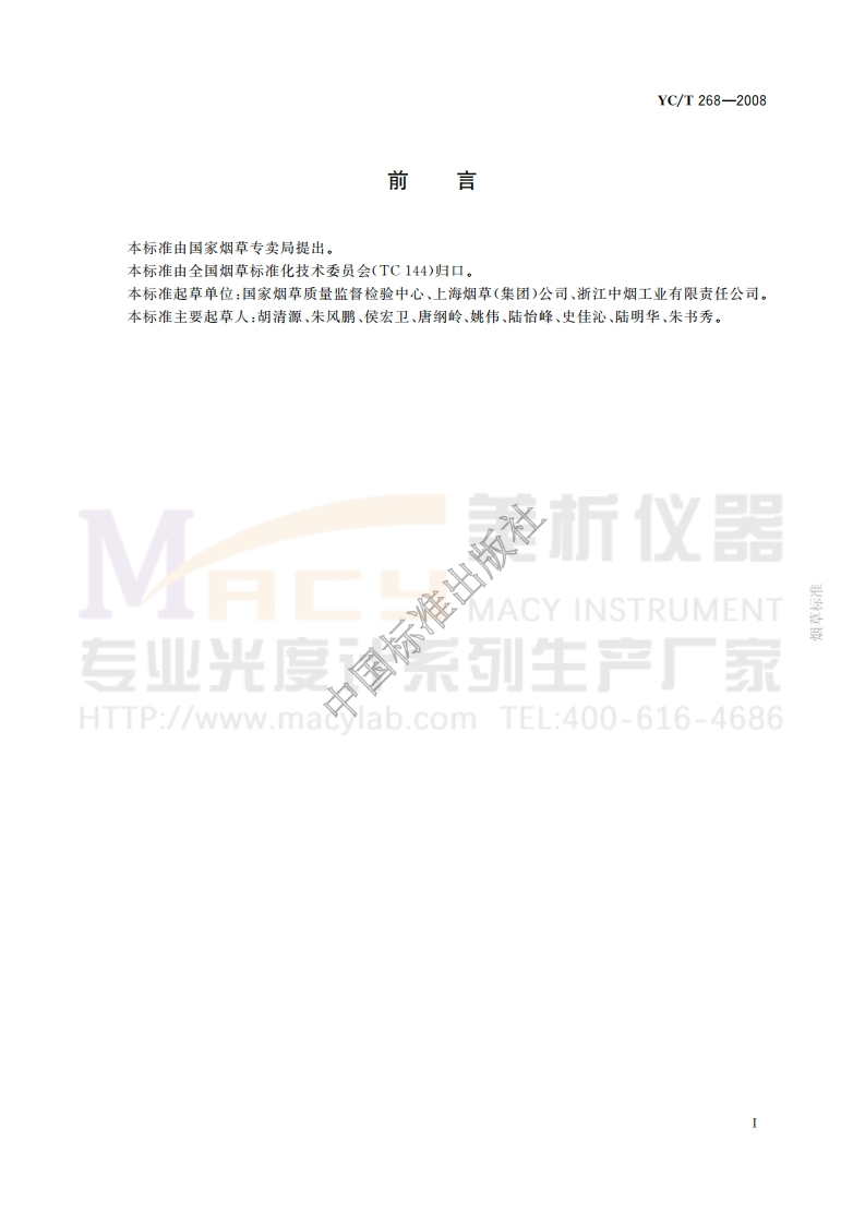 ICs65.160X85备案号:24036一2008YC中华人民共和国烟草行业标准YC/T268-2008烟用接装纸和接装原纸中砷、铅的测定石墨炉原子吸收光谱法Determination of arsenic and lead in tipping paper and tipping base paper forcigarette-Graphite furnace atomic absorption spectrometryHTTP://www.malab.com TEL:400-616-46862008-05-27发布2008-07-01实施国家烟草专卖局发布