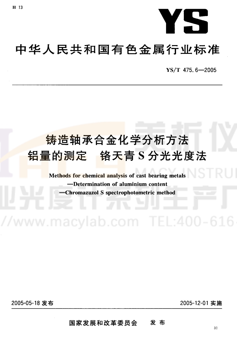 YST-475.6-2005-铸造轴承合金化学分析方法-铝量的测定-铬天青S分光光度法348072@abc2个月前发布关注私信0.17MB7页022YST-475.6-2005-铸造轴承合金化学分析方法-铝量的测定-铬天青S分光光度法此内容为付费资源,请付费后查看¥17¥23黄金会员免费钻石会员免费立即购买您当前未登录!建议登陆后购买,可保存购买订单付费资源 第1页 / 共7页 第2页 / 共7页 试读已结束,还剩5页,您可下载完整版后进行离线阅读 THE END标准规范 文本预览 H13YS中华人民共和国有色金属行业标准YS/T475.1475.7-2005铸造轴承合金化学分析方法Methods for chemical analysis of cast bearing metalsNSTRU光度计系刮生产//www.macylab.com TEL:400-6162005-05-18发布2005-12-01实施国家发展和改革委员会发布 查看更多 收起部分 喜欢就支持一下吧收藏