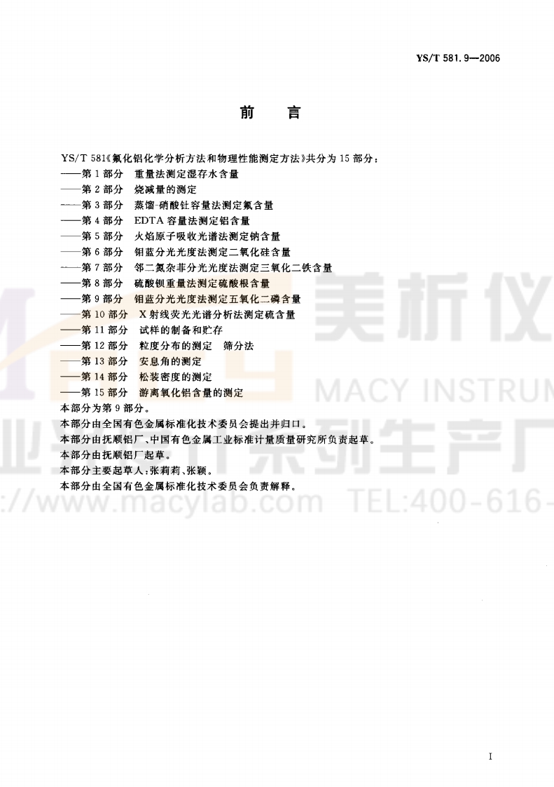 ICS71.100.10H21YS中华人民共和国有色金属行业标准YS/T581.9-2006氟化铝化学分析方法和物理性能测定方法第9部分钼蓝分光光度法测定五氧化二磷含量Determination of chemical contents and physical properties ofaluminium fluoride Part 9:Determination of phosphoruo content//www.macby molybdophoshoric liue photometric method00-6162006-03-07发布2006-08-01实施国家发展和改革委员会发布