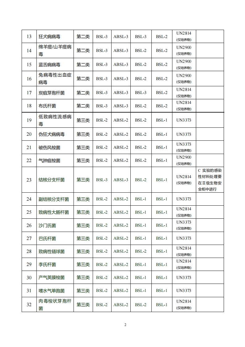 附件:动物病原微生物实验活动生物安全要求细则实验活动所需实验室生物安全级别f运输包序号动物病原c未经培微生物名称程度备注a病原分b动物感养的感染d灭活材分类离培养染实验性材料实料实验装要求验C实验的感染UN2900口蹄疫病毒第一类性材料的处理BSL-3ABSL-3BSL-2BSL-2(仅培养物)要在Ⅱ级生物安全柜中进行C实验的感染高致病性禽流感UN2814性材料的处理2第一类BSL-3ABSL-3BSL-2BSL-2病毒(仅培养物)要在Ⅱ级生物安全柜中进行C实验的感染UN2900性材料的处理3猪水泡病病毒第一类BSL-3ABSL-3BSL-2BSL-2(仅培养物)要在Ⅱ级生物安全柜中进行非洲猪瘟病毒第一类BSL-3ABSL-3BSL-3BSL-3UN29005非洲马瘟病毒第一类BSL-3ABSL-3BSL-3BSL-3UN29006牛瘟病毒第一类BSL-3ABSL-3BSL-3BSL-3UN2900小反刍兽疫病毒第一类BSL-3ABSL-3BSL-3BSL-3UN2900牛传染性胸膜肺第一类BSL-3ABSL-3BSL-3BSL-3UN2900炎丝状支原体牛海绵状脑病病第一类BSL-3ABSL-3BSL-3BSL-3UN3373原10痒病病原第一类BSL-3ABSL-3BSL-3BSL-3UN3373UN290011猪瘟病毒第二类BSL-3ABSL-3BSL-2BSL-2(仅培养物)UN290012鸡新城疫病毒第二类BSL-3ABSL-3BSL-2BSL-2(仅培养物)