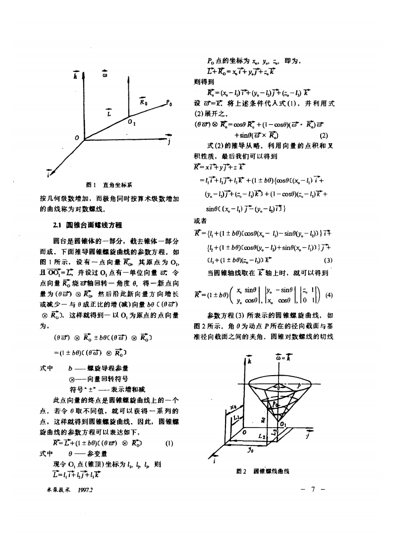 螺旋离心泵的原理与设计方法何希杰劳学苏(石家庄杂质泵研究所:050011)摘要:推导了介质质点在螺旋离心泵叶轮叶片工作面和负压面上的螺线运动方程,提出了螺旋离心泵水力设计方法,列举了螺旋离心泵水力设计、计算与绘形例子。本文对螺旋离心系设计和研究具有实际指导意义.关键词:螺旋离心泵原理设计锥体螺线1928年,A.布斯曼(A.Busemann)较早地1前言在离心泵叶轮.上采用对数螺旋型线.1961年,J,林比奇在“模型挖泥泵特性”一文中”,I960年,瑞士工程师马丁·斯坦勒(Martin通过试验指出,采用对数螺线叶型叶轮的泵,sthle)发明带螺旋式离心叶轮(Screw centrifugal其输送清水和浆体时的效率均高于淅开线等叶impeller)的螺旋离心系,先后获得秘鲁、美国型的叶轮。目前渣浆泵叶轮叶片型线设计中,和西德等国的专利,第一台螺旋离心泵用于秘比较广泛地采用对数螺线鲁的一家鱼肉加工厂.英国Hidrostal Process本文作者经过多年对螺旋离心泵的分析研Engineering Ltd.公司首家获得该泵的生产究,针对目前一些设计方法中缺乏理论分析和权.德国Hidrostal GmbH和KSB公司已经开水力设计方法不具体等欠缺,提出了螺旋离心发出该泵的系列产品,英国Sigmund、日本荏泵叶轮叶片工作面和负压面空间曲线方程和具原、久保田、太平洋机工、石川岛播磨重工业体的水力设计方法。此法的可操作性强,对螺等公司也相继开发出这种泵的系列产品,旋离心泵的研究和设计具有实际意义,螺旋离心泵是一种具有三元螺旋式单叶片叶轮的无堵塞泵。这种泵最初用于输送鱼类2叶片空间曲线方程它具有防堵塞性能好、陡降的流量扬程特性曲线、对物科损伤小、较高的泵效率,目前已广螺旋离心泵叶轮,在轴面图上其前半部分泛应用于输送污水、泥浆、果品蔬菜、高粘性呈螺旋式,后半部分为离心式。前半部分螺旋液体以及具它含有固体物的介质。叶轮外形,一般由圆锥台面、曲面圆台面或者螺旋离心泵的设计原理和设计方法,从对圆柱面构成。叶轮叶片型线为空间曲线,是由液体在泵内流动研究方面看,日本、西德等国动点在圆锥台面上或者曲面圆台面上作螺旋运开展工作比较早和深入,但是水力设计方面的动.即一方面绕固定轴线等速或者非等速的圆资料极少。国内在螺旋离心泵设计方法研究方周运动,另一方面又同时沿着母线方向作等速面取得一些进展,先后发表文章和资料〔1)一或者非等速直线运动所形成的运动轨迹,〔5),这些资料对于圆锥形轮般及其上的三元螺线分为阿基米德螺线、抛物线螺线、双螺旋形叶轮叶片的形成缺乏理论研究和分析.曲螺线和对数螺线,一般采用对数螺线。动径-6-水系技术1997.3