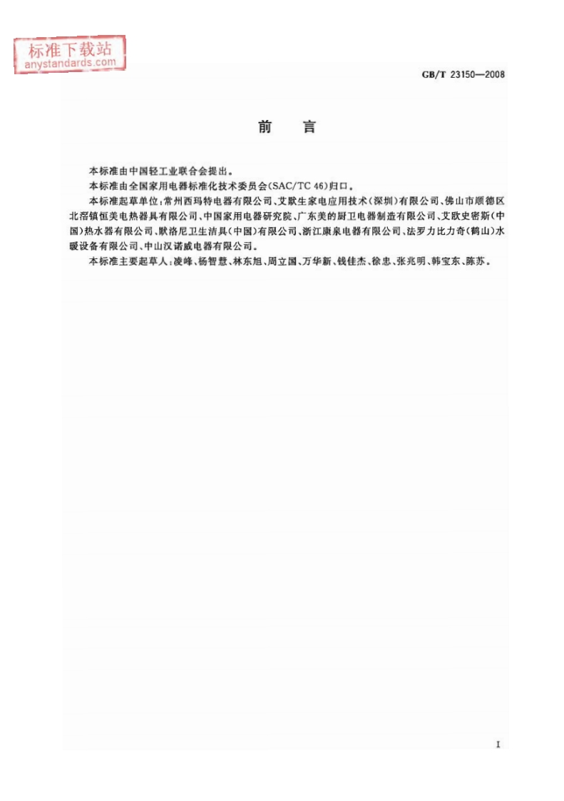 热水器用管状加热器-GBT-23150-2008348072@abc2个月前发布关注私信0.70MB8页024热水器用管状加热器-GBT-23150-2008此内容为付费资源,请付费后查看¥17¥23黄金会员免费钻石会员免费立即购买您当前未登录!建议登陆后购买,可保存购买订单付费资源 第1页 / 共8页 第2页 / 共8页 试读已结束,还剩6页,您可下载完整版后进行离线阅读 THE END标准规范 文本预览 1CS97.100.10标准下我站anystandards.comGB中华人民共和国国家标准GB/T23150-2008热水器用管状加热器Tubular heating element for water heater2008-12-30发布2009-09-01实施中华人民共和国国家质量监督检验检疫总局中国国家标准化管理委员会发布 查看更多 收起部分 喜欢就支持一下吧收藏