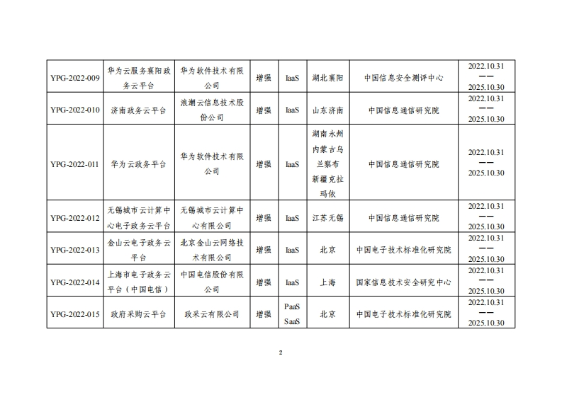 通过云计算服务安全评估的云平台安全号云计算煤务平合云爆务南能力机房位量实花评价的专业技术机构有教期纸别模式河南省政务公共云河南中原云大数据2022.09.23YPG-2022-004(中原云华三平增强laaS河南郑州国家信息技术安全研究中心一集团有限公司2025.09.22台)青岛市政务大数据青岛海信网络科技山东青2022.09.23YPG-2022-005增强laaS中国信息通信研究院一一和云计算中心股份有限公司岛、德州2025.09.22蹈光鸟鲁木齐市政新疆中科蹈光云计新疆乌魯2022.09.23YPG-2022-006增强laaS国家信息技术安全研究中心一一务云平台算有限公司木齐2025.09.22成都电子政务云平成都城市云计算技2022.10.31YPG-2022-007增强laaS四川成都国家信息技术安全研究中心一一台(二期)术有限公司2025.10.30阿里云电子政务云阿里云计算有限公2022.10.31YPG-2022008增强laaS北京中国电子技术标准化研究院一一平台司2025.10.30