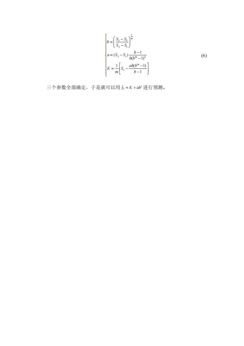 时间序列法预测原理时间序列模型中,采用修正指数曲线法,其模型表达式为:=K+ab(1)在此数学模型中有三个参数K,α和b要用历史数据来确定。把时间序列的n个观察值等分为三部分,每部分有m期,即n=3m。第一部分:片,,K,ym;第二部分:1y+2K,2m;第三部分:2+1,2+2K,m令每部分的趋势值之和等于相应的观察值之和,由此给出参数估计值。三和法步骤如下:记观察值的各部分之和(2)且S,-(k+ab)-mk +ab(l+b+b+Lb)S;=(k+ab)=mk +ab+L)(3)1=标+1(K+ab')=mk +ab2m"(1+b+b2+Lb-)由于(1+b+b2+Lb-)b-1)=b-1(4)则根据指数曲线y=%e“,得S,=mk+abbb-1S:=mk +abmbb-1(5)S3 =mk+ab bb-1解得