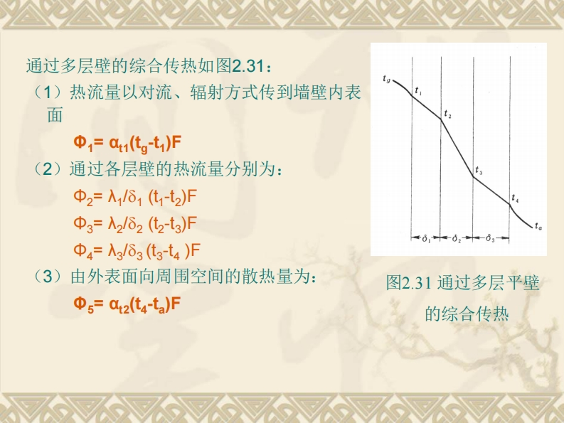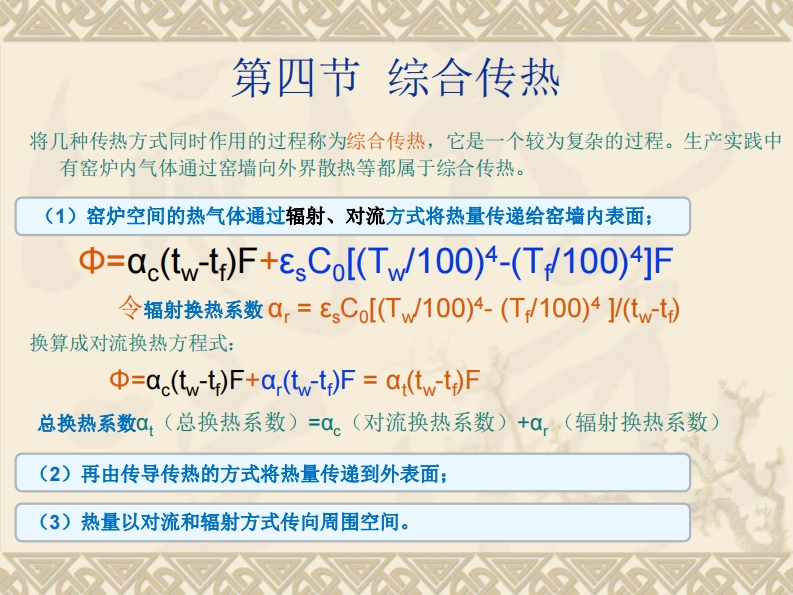 第四节综合传热将几种传热方式同时作用的过程称为综合传热,它是一个较为复杂的过程。生产实践中有窑炉内气体通过窑墙向外界散热等都属于综合传热。()窑炉空间的热气体通过辐射、对流方式将热量传递给窑墙内表面;=ac(tw-t)F+sCo[(Tw/100)4-(T/100)4]F令辐射换热系数a,=eCo[(Tw√/100)4-(T/100)4]V(twt)换算成对流换热方程式:=ac(tw-t)F+a(tw-t )F=a(tw-t)F总换热系数a,(总换热系数)=a。(对流换热系数)+a,(辐射换热系数)(2)再由传导传热的方式将热量传递到外表面;(3)热量以对流和辐射方式传向周围空间。