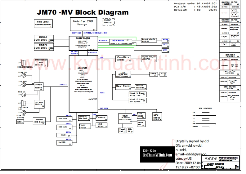 Projectcode:91.4N01.0011■162192PCB P/N:4B.401.08JM70 -MV Block DiagramREVIS IONSB0B2465Y5CLK GEN.Mobile CPU5112Penryn06t05G67/a00/1060g1.057DDR3800/1066洱CantigaVGA BoradDDR31及ceanecto气00/1066盟CRTG3g幅aC-LinkCardBus9R0OOF ER42ICH9Mtinh.coY图四图IT因CuumA2AAwha山New Card8211秘Mins i CarpWire IAN2TV TUMER盟LPC22CONN.SATA地%1ELier4FaDigitally signed by ddDN:cn=dd,o=dd,Dien Danou=dd,KyThuatViTinh.Comemail=dddd@yaboocom,c=US*利青通Date:2009.12.04BLCCKDACRAN19:18:27+0T00