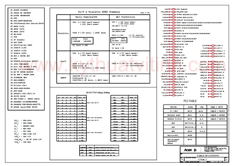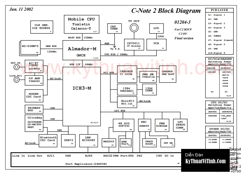 Jan.112002C-Note 2 Block DiagramPCB LAYERL1:Signal 1Mobile CPU12:G20TV OUTTualatin01204-313:Signal 2CLK GEN.CRTICg950806Celeron-TCONNLCD1:Signal 3ForC2 SOVP4,s15:G20C3DVHOST BUS133MHzLVDSL6:POWERFinal wersion17:Signal 4(wak)ROBC且70011VCH18:Signal 5SO-DIMM*2MEM BUSAlmador-MTo P.R.1L9:G0133M组zDV0BUs/66M组2110:519n16GMCH7,,DC/DC&CHARGERMIC IN&80認Switching PowerHUB I/F66M组zM0X1631MX1772AD1881AINDUTSOUIPUIS.NPCI BUSCARDBUSCARDBUSDCNA TOUT+TI 1410ALine outPWR SWONE SLOTUAT +WITP52211AOP AMPAC-Link+建TPA0202+四ICH3-M13941394TSB43AB21CONNMODEMCDC Card,MiniPCINC-LinkCPU DC/DC802,11bSwitching PowerPRIMARYIDE0X1718MX1714HDDLPC BUSINPUTSOUTPUTSOLUltraBay+在_证IDE+VOC?CD/DVDROM1,14,1KBCLPC组,拉CD-RN/FDDNS SIOEWHDEBUGNESTPC87392M3885982802BUSBCONNOTHER DC/DC0X1644MX1792INPUISOUTPUISBluetoothLANCDC CardU8B*282562ET+1.10型+1.0NC-LinkMX3243PRNTRACK封+1.1w0+1.5PortPOINTINT KBnLineInLine OutRJ11USBRJ45RS232 PRN Port FDD PS2CRT DC InDien DanemaKyThuatViTinh.ComPort Replicator (244PIN)+0700